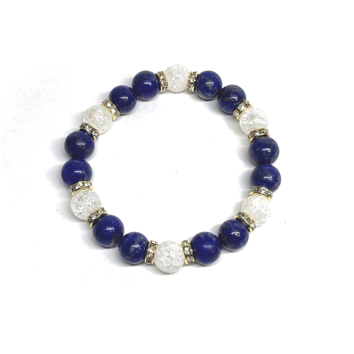 こちらは、ラピスラズリとクラック水晶を組み合わせたパワーストーンブレスレットです。間にはロンデルを挟み高級感あるデザインに仕上げております。石大きさは腕にも馴染みやすいように10mm玉で内径約18cm(伸可能)です。(サイズ変更の場合は取引ナビにてご連絡をお願いします。) 数に限りがございますので気になる方はお早めにどうぞ。