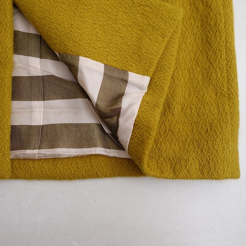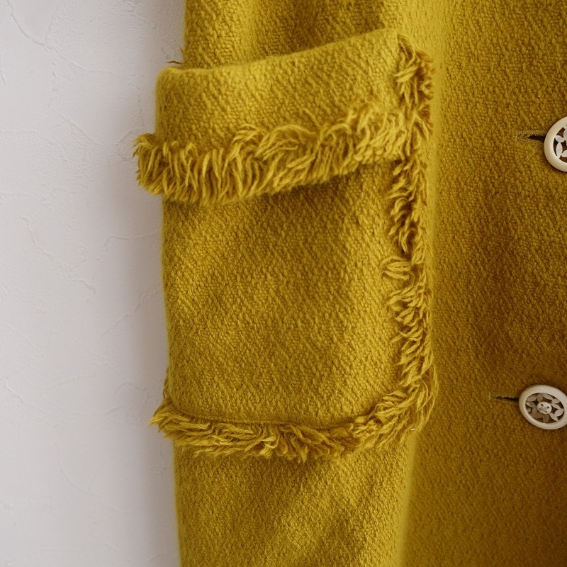 mina perhonenのmellow アンゴラコートです。カラーはマスタードで、やや凹凸感のある柄織りのやや毛羽感のある厚手素材です。フロント飾り加工ボタン開閉式で、フロント左右ウエストにポケットがあり、襟&ポケットの縁はフリンジ仕様になっており、ライトピンク×カーキのボーダー柄の総裏地付きです。定価(メーカー希望小売価格)126000円の商品です。 |