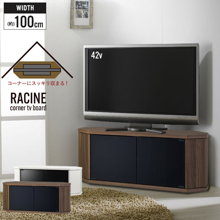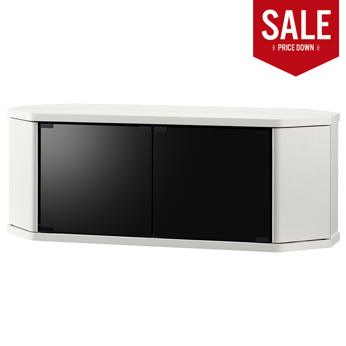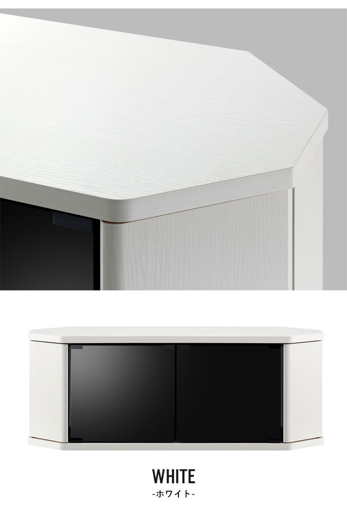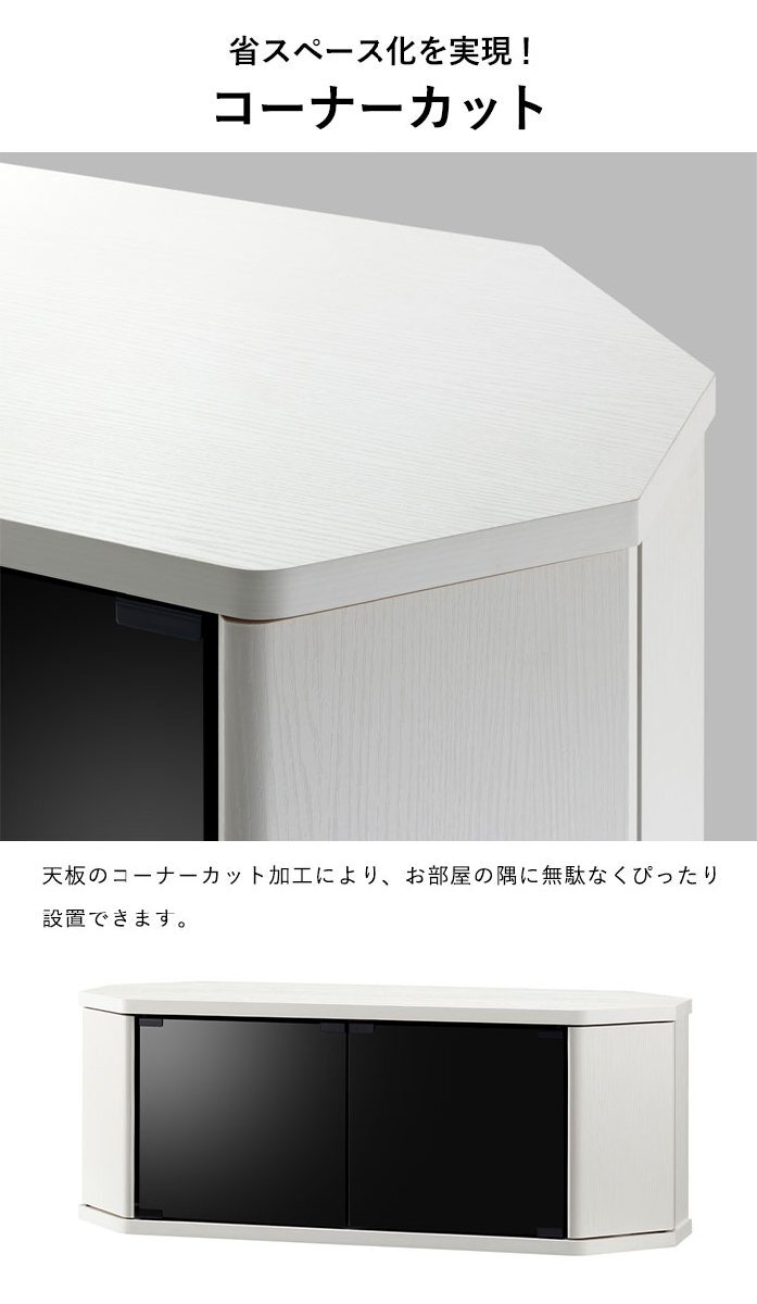 お部屋のコーナーにぴったりフィットするコーナーテレビ台。 テレビを設置した際の導線も考えた形状で、省スペース化を実現。 ガラス扉は強化ガラスに飛散防止フィルムが貼ってあり、万一ガラスが割れた際にも飛び散りにくい安心設計。 ブラックスモークガラスで中身も隠せるおしゃれなデザイン。 両サイド扉部にはルーターや家庭用ゲーム機の縦置き収納が可能。 背面には配線用開口部があり、配線もスムーズ。(薄板に切り込みが入っています。) 正面から見えにくいスマートキャスター付きで移動もスムーズ。 落ち着いた質感のあるウォールナット木目のブラウンとモダンな印象の少し艶のあるPVCシートの白木目のホワイトの2色よりお選びいただけます。 |