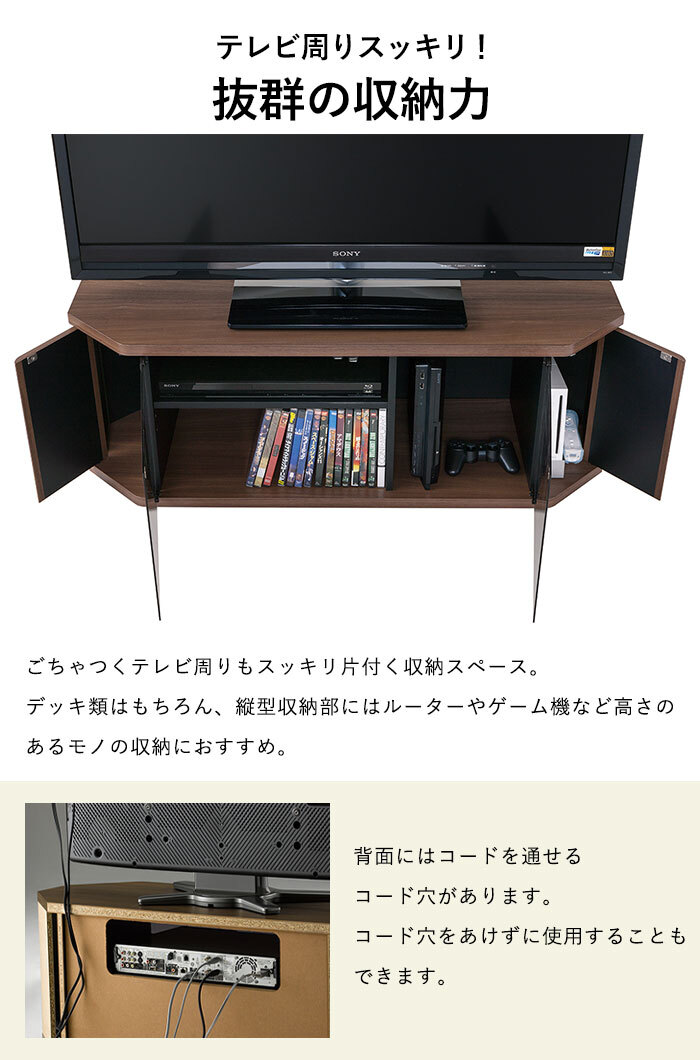 ・ コーナー設置対応 ・ スマートキャスター付きで移動もラクラク ・ 左右の収納スペースは人気ゲーム機縦置き収納可能 ※収納できないゲーム機もございます。サイズをよくご確認願います。 |