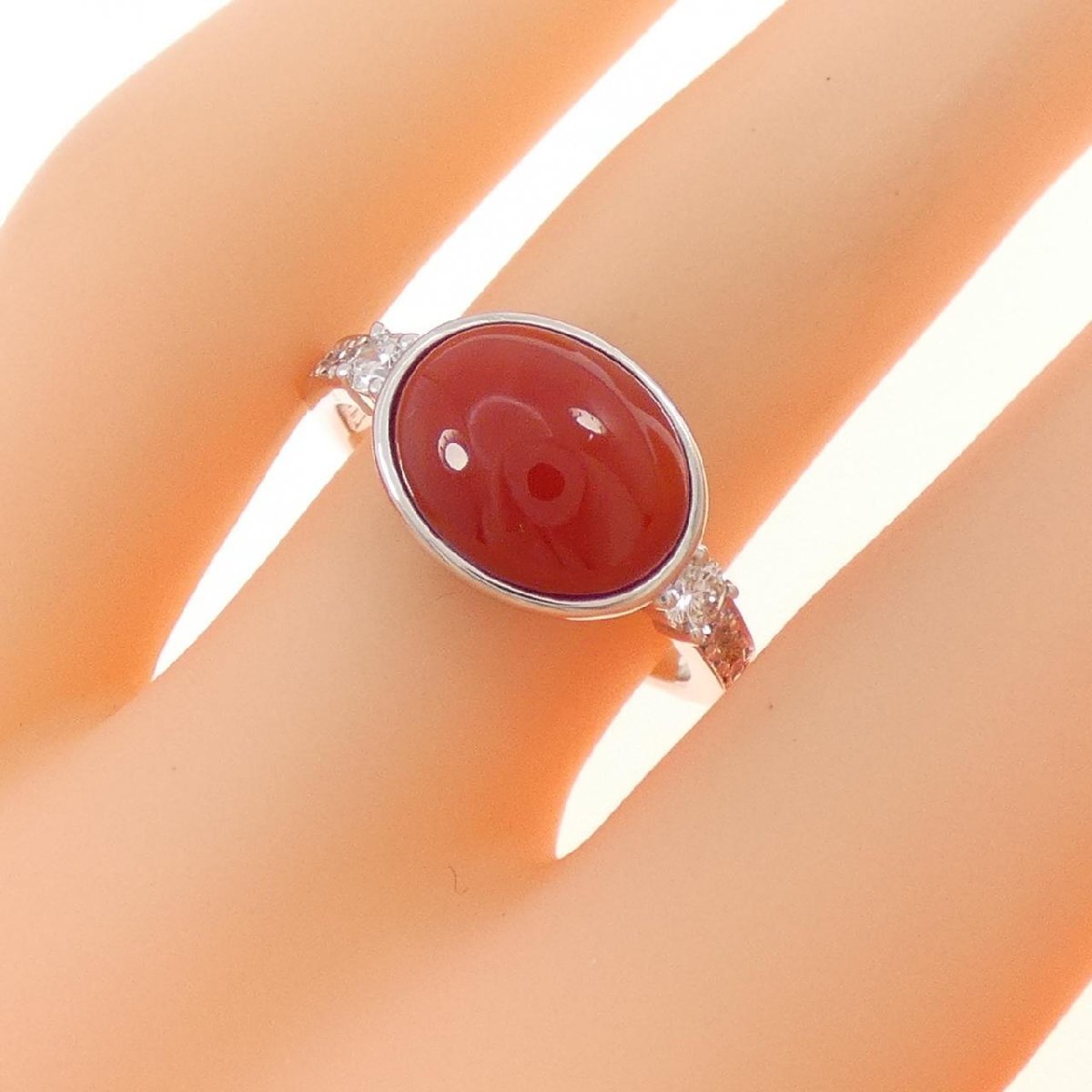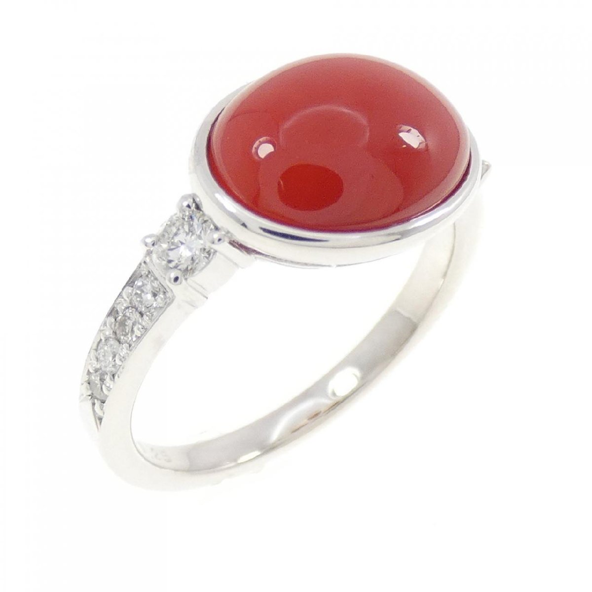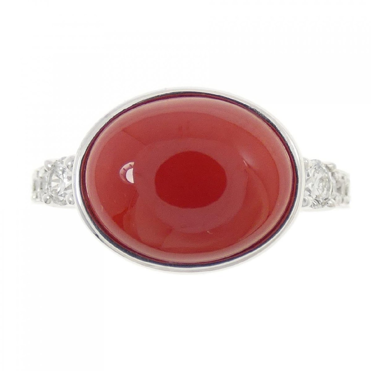トロリと艶のある濃厚な赤いサンゴ。両脇に煌めくダイヤモンドがあしらわれ、装いのアクセントになってくれそうです。