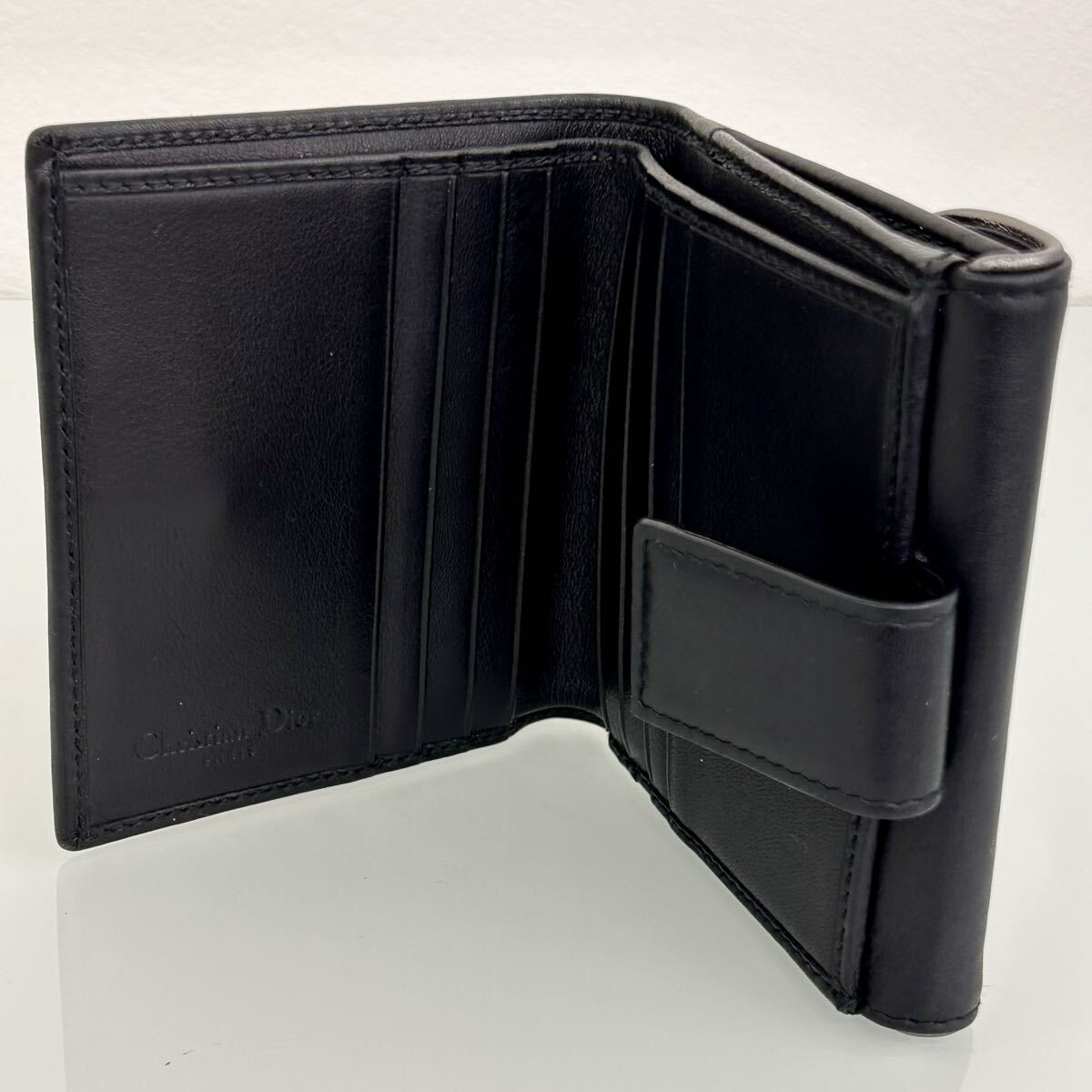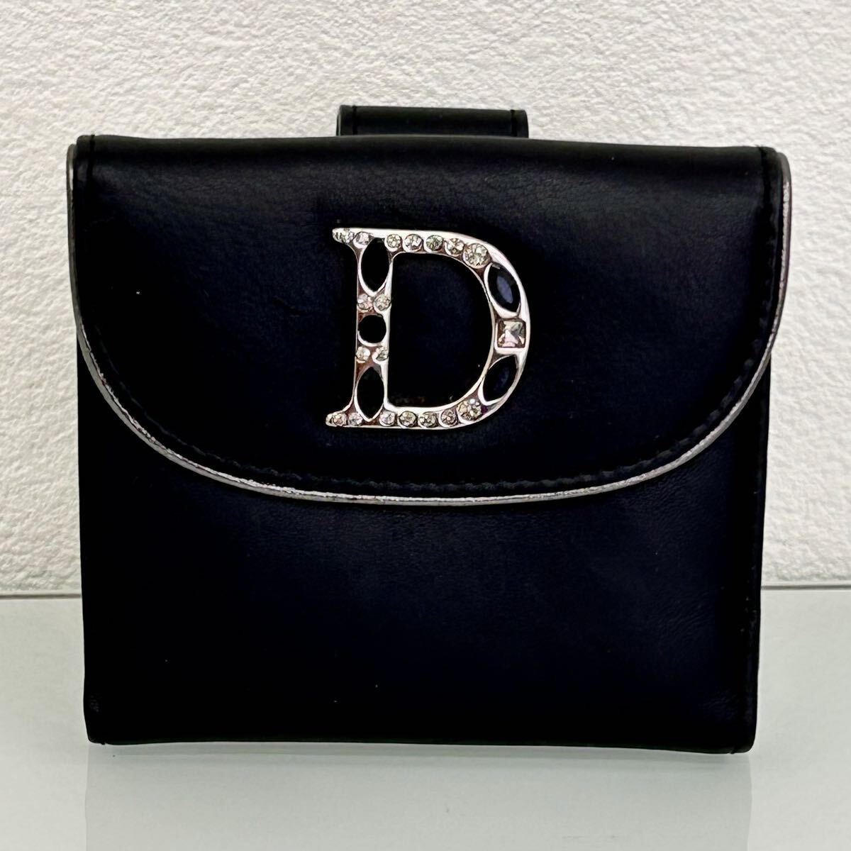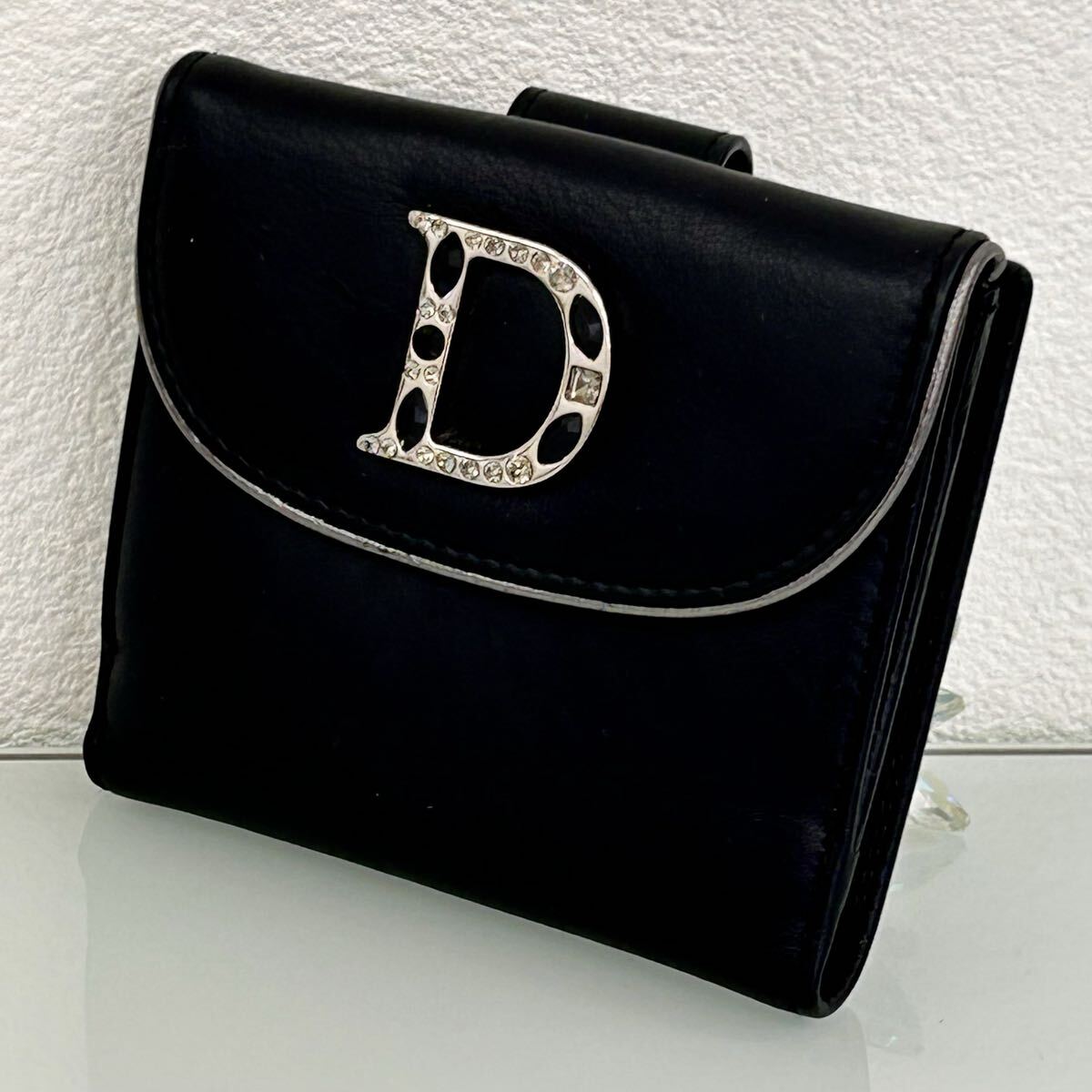 【未使用に近い】Christian Dior クリスチャンディオール Wホック レザー ブラック ロゴ ラインストーン 財布 二つ折り