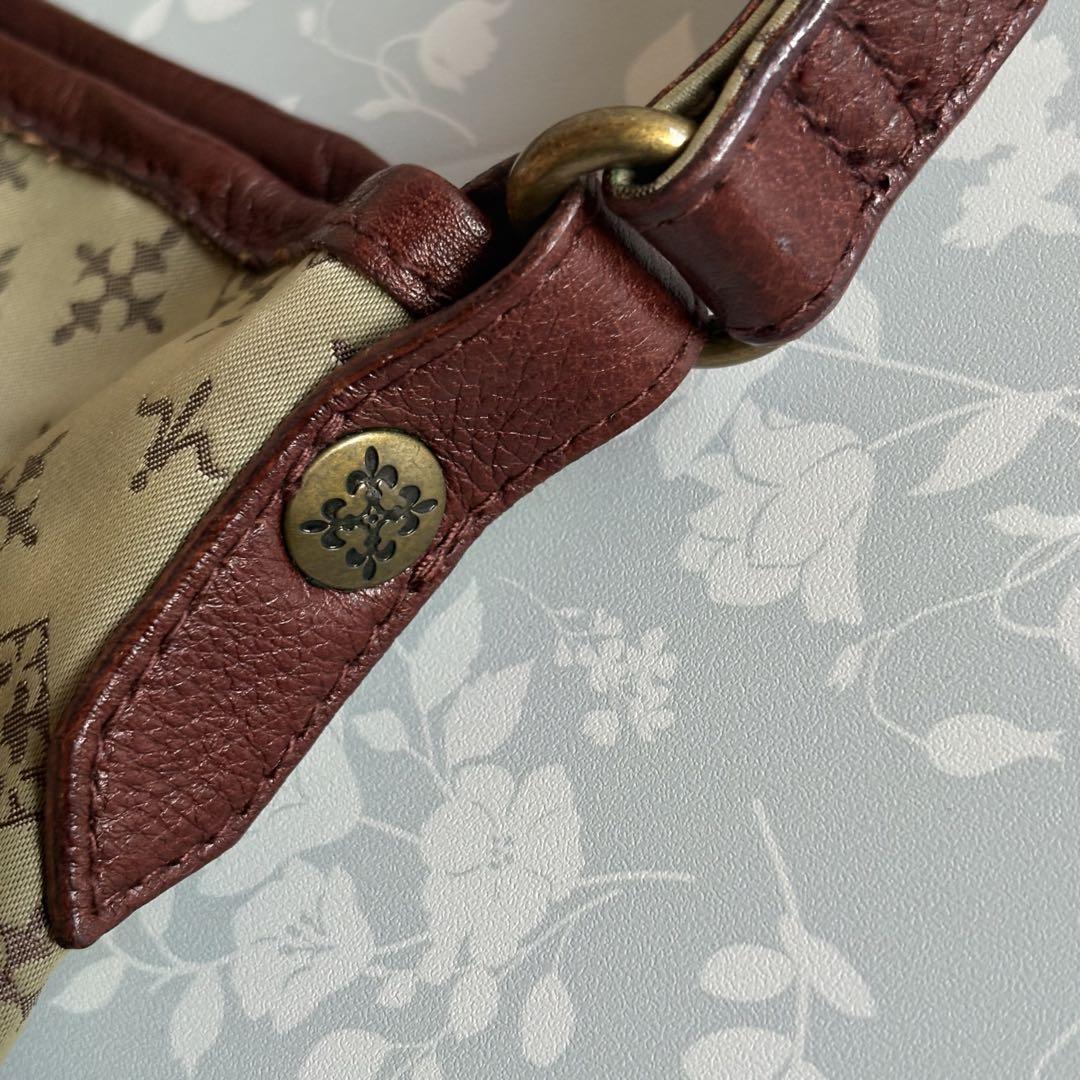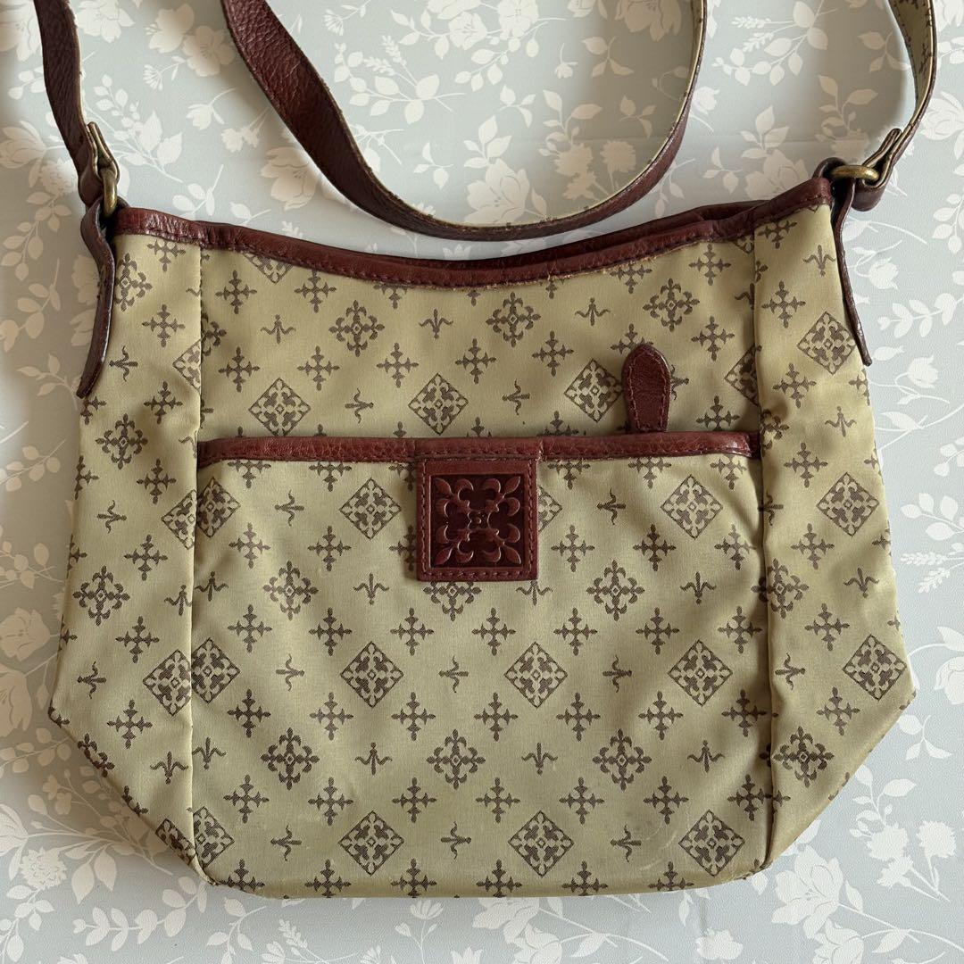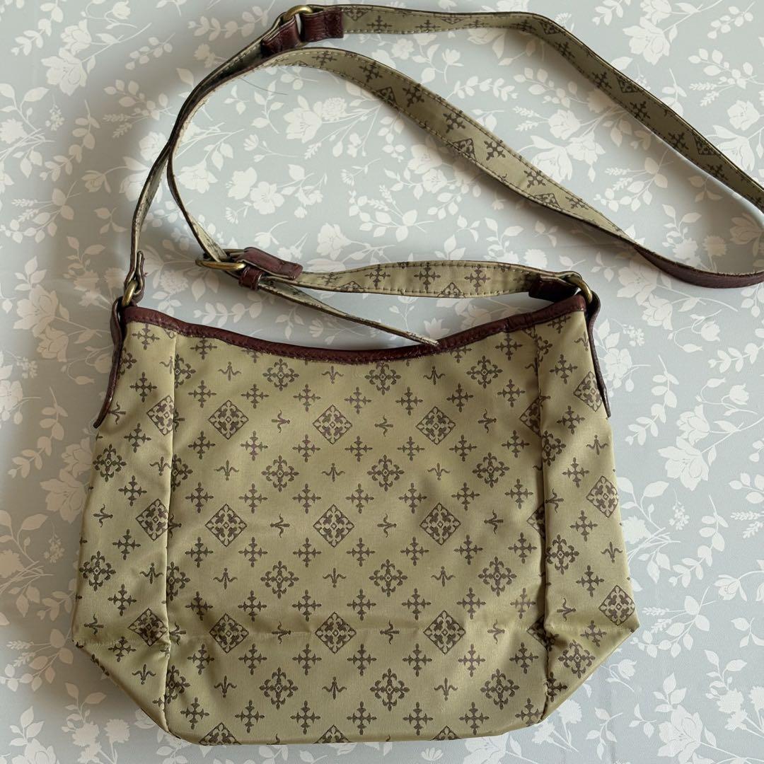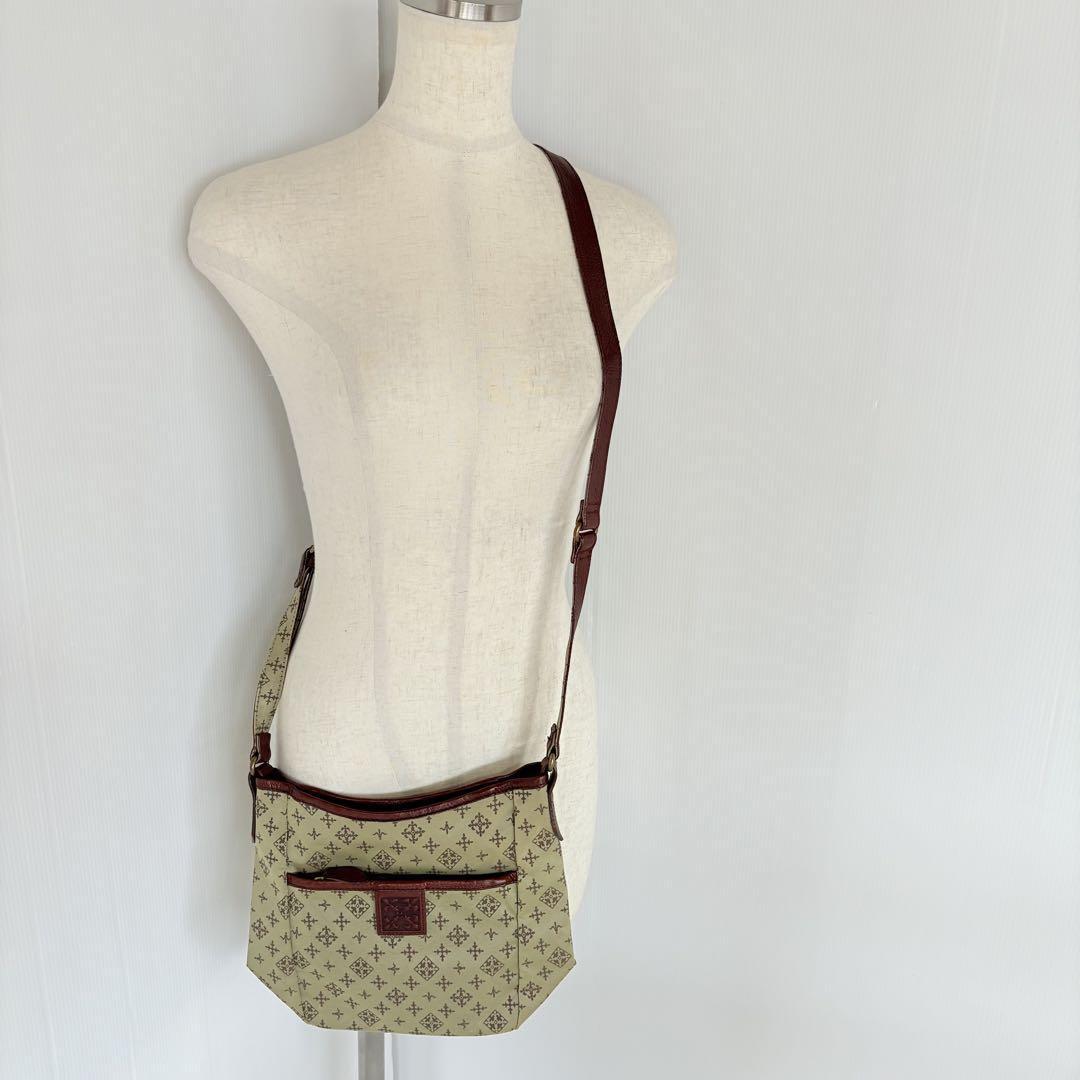 幾何学模様のベージュショルダーバッグ、外側ポケット付きで実用的。