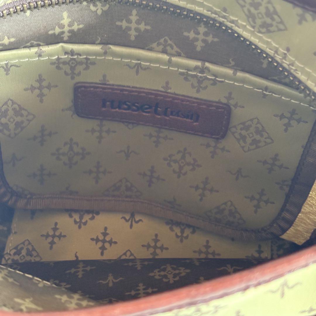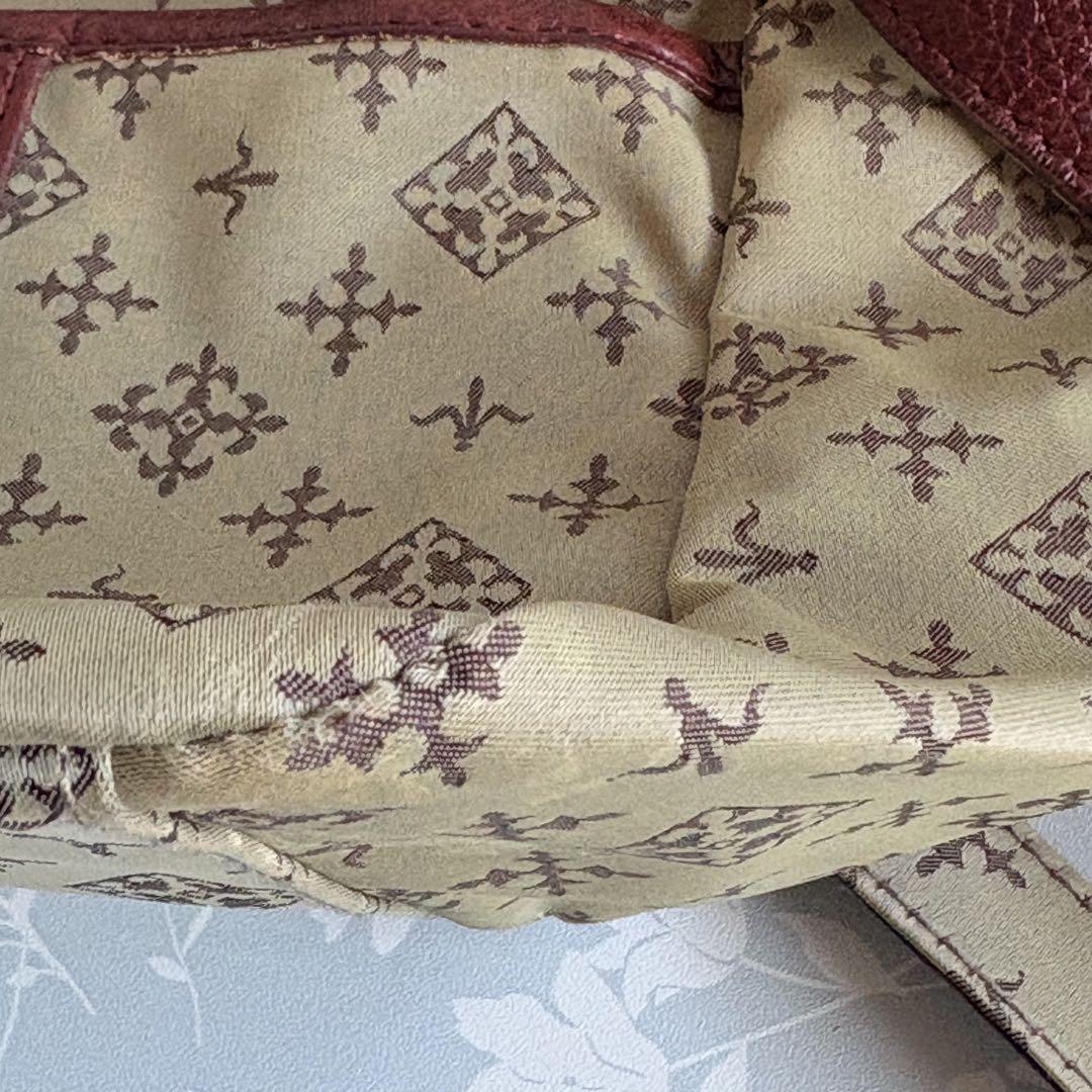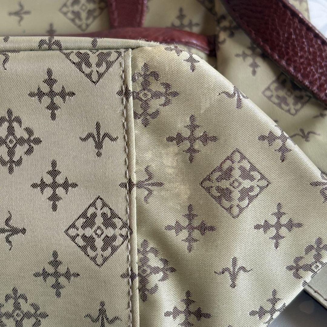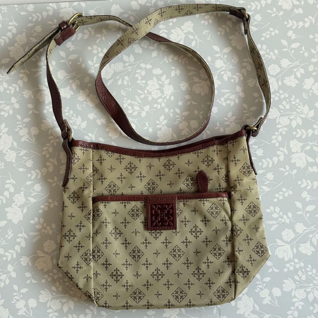 幾何学模様のベージュショルダーバッグ、外側ポケット付きで実用的。