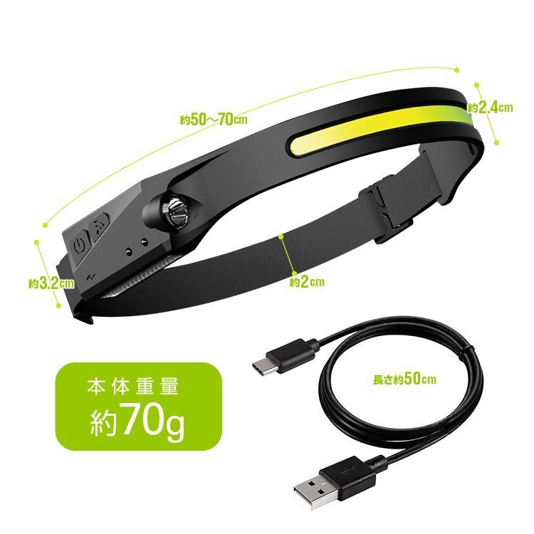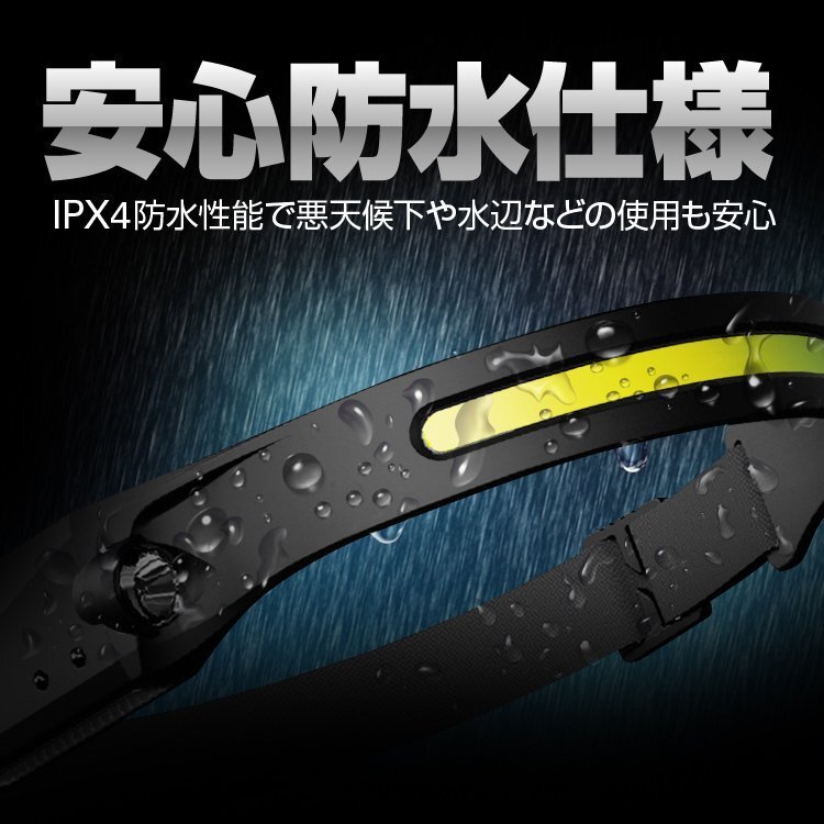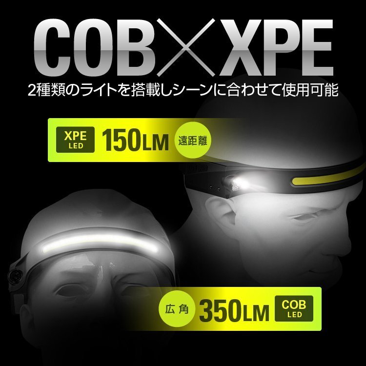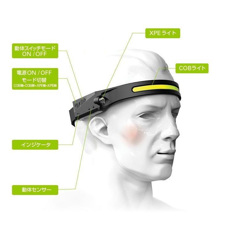 ◆COB-LED/XPE-LED USB充電ヘッドライト 防水仕様 高輝度350LM 10W 軽量小型 IPX4防水 動体感知スイッチ機能 光量モード切替 防災グッズ 自転車ライトにも 夜間作業 ウォーキング 犬の散歩などに COBUHX200
