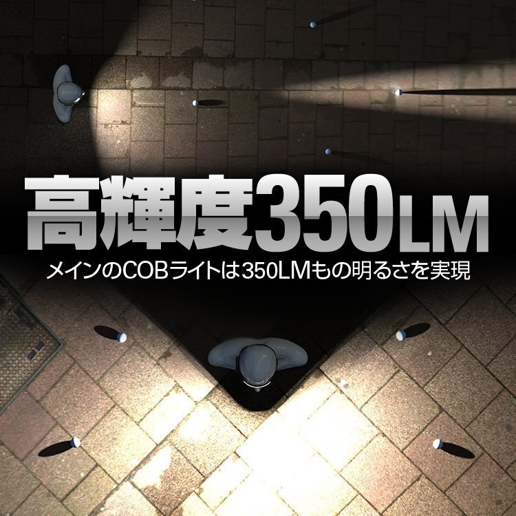 広角で役立つ最大350LMの高輝度COBライトと、遠距離照射ができる最大150LMのXPEライト搭載