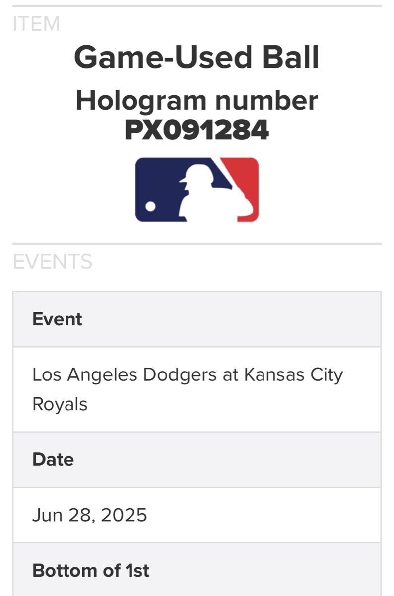 2025年6月28日、大谷選手が所属するロサンゼルス・ドジャースがカウフマン・スタジアムでカンザスシティ・ロイヤルズと対戦した試合で使用されたボールです。