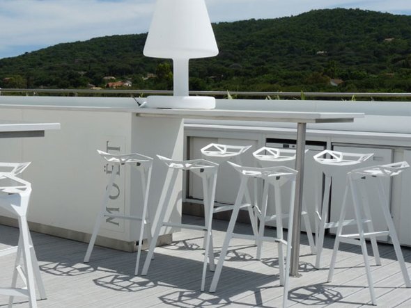 世界中のインテリアクリエイションで選択されている、幾何学的な形状と浮いたような座面がアイキャッチな名作カウンターチェア。MAGISより。