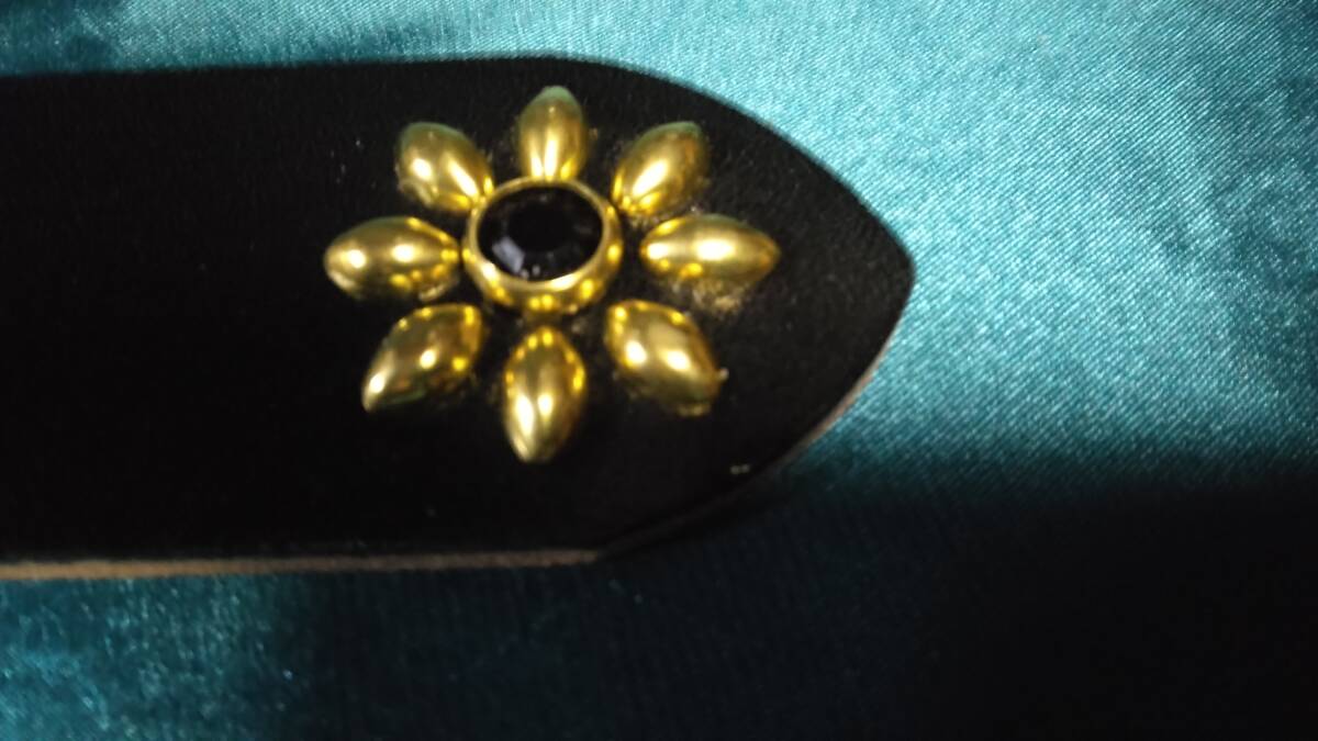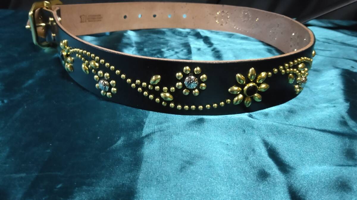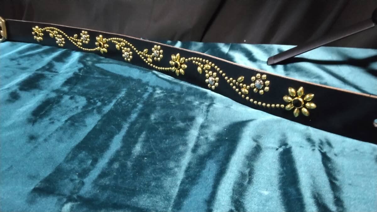 アメリカ老舗のスタンダードリベット社のスタッズを使いツタとフラワーをモチーフにしたスタッズベルトを製作しました。色はブラスのラウンドとニッケル・アクリルスポッツにブラックを使用。