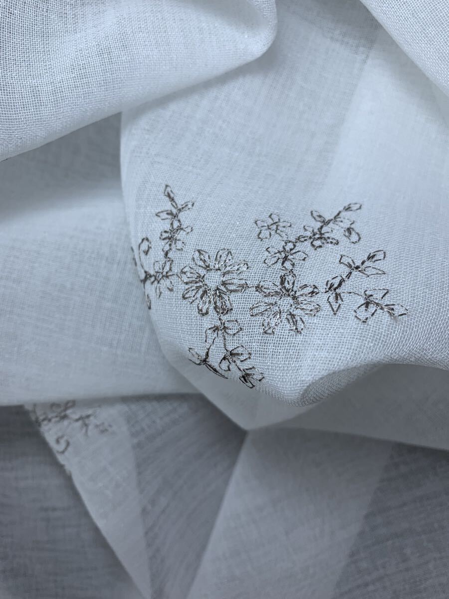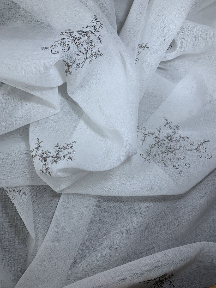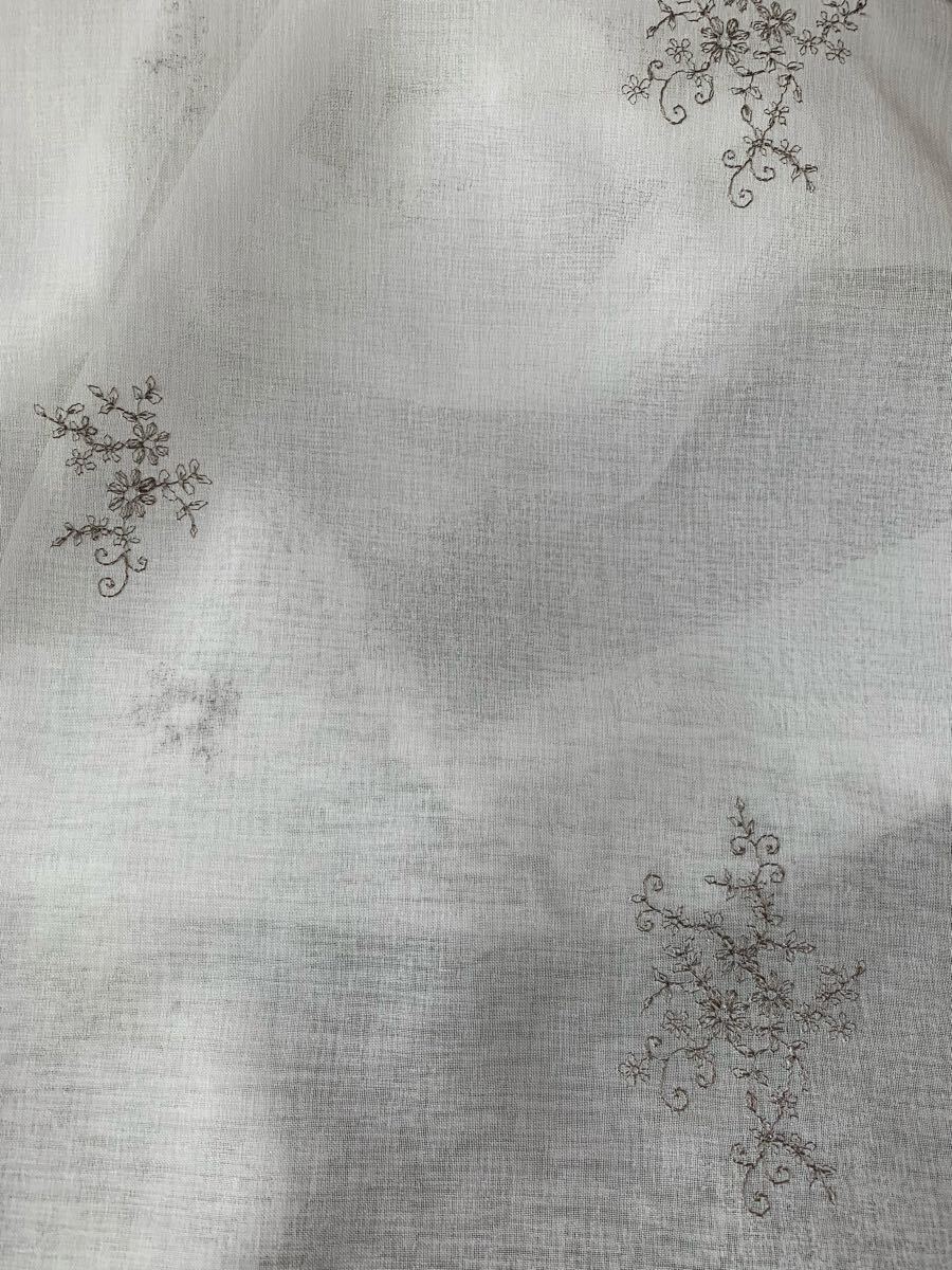 ●天然素材の様な白地レースに、グレージュ色の小花の刺繍生地●ポリエステルのカーテン用レースで、丈夫な生地です●可憐な可愛いさが、こころ癒される、素敵な一品です●