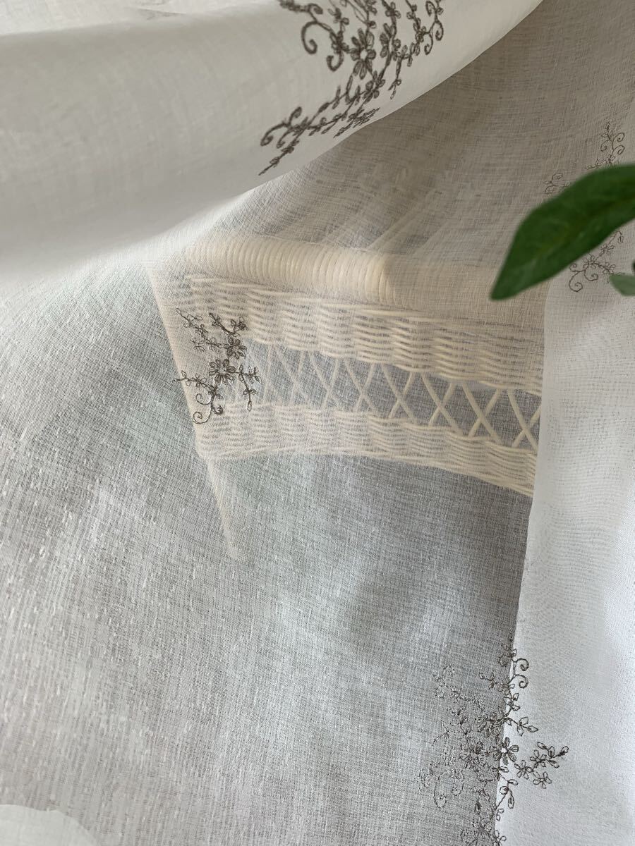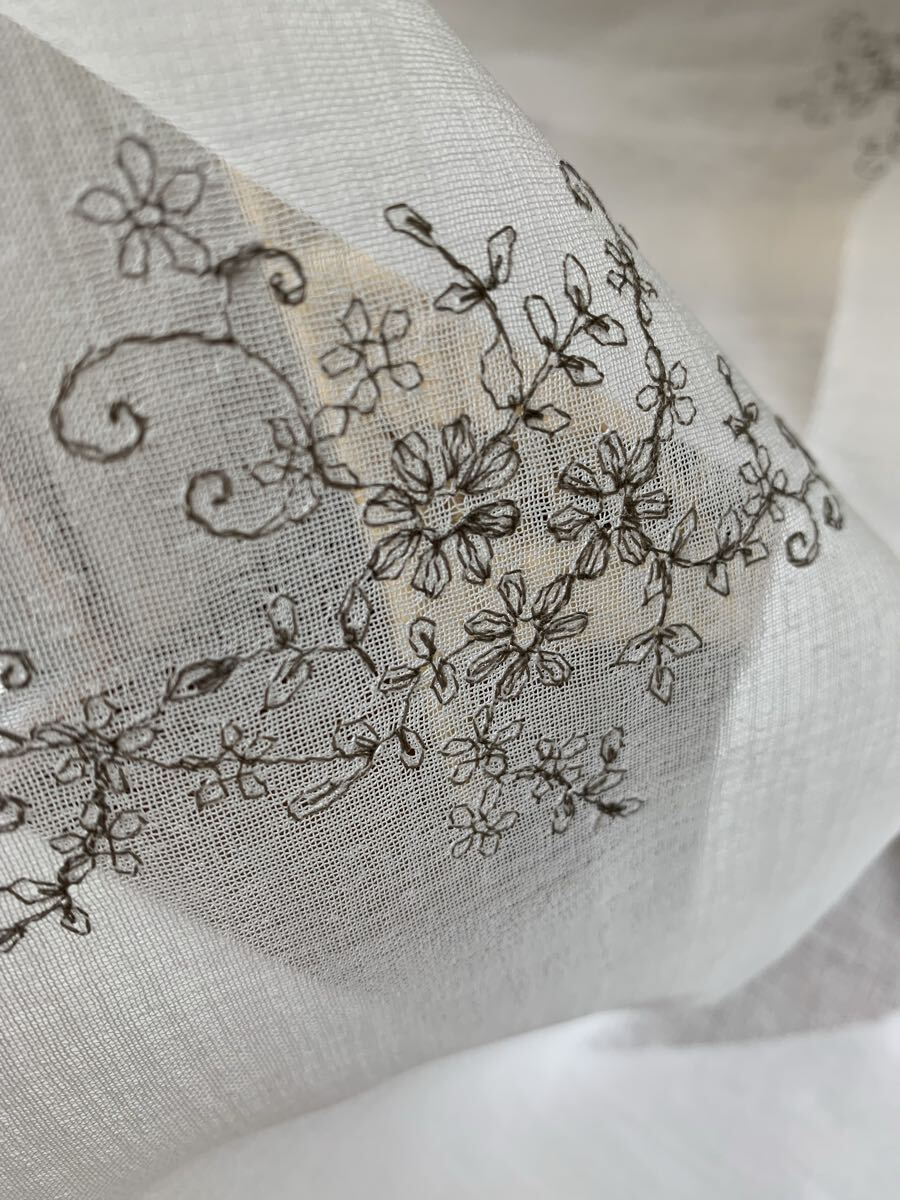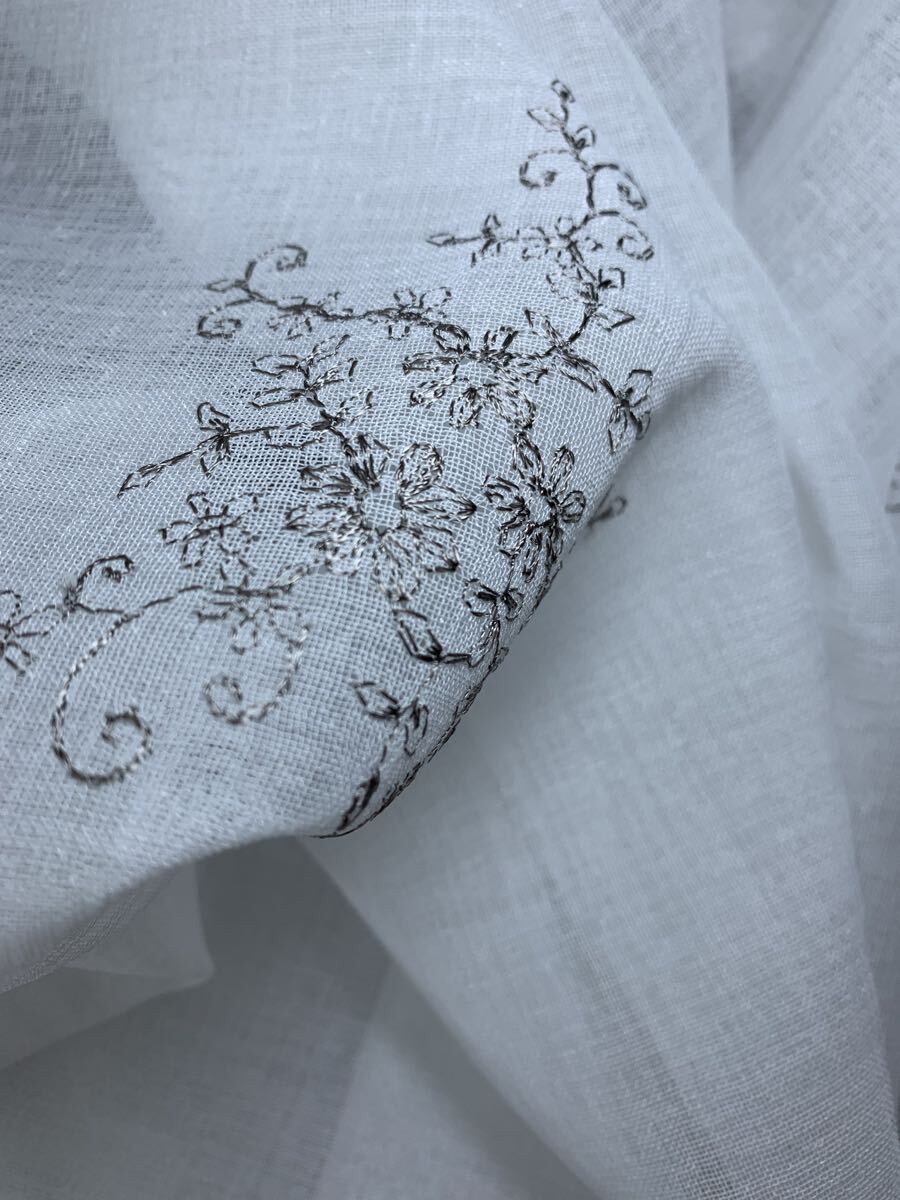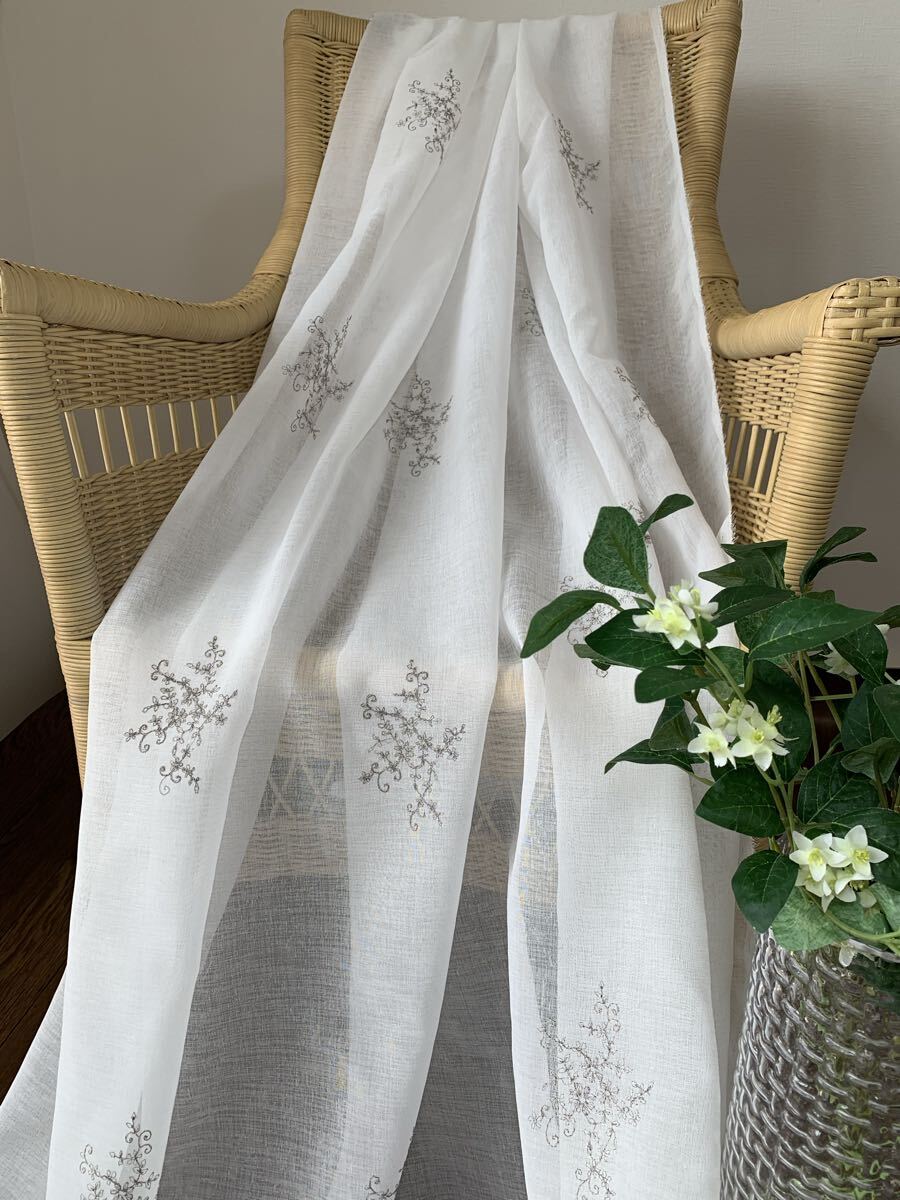 ●天然素材の様な白地レースに、グレージュ色の小花の刺繍生地●ポリエステルのカーテン用レースで、丈夫な生地です●可憐な可愛いさが、こころ癒される、素敵な一品です●
