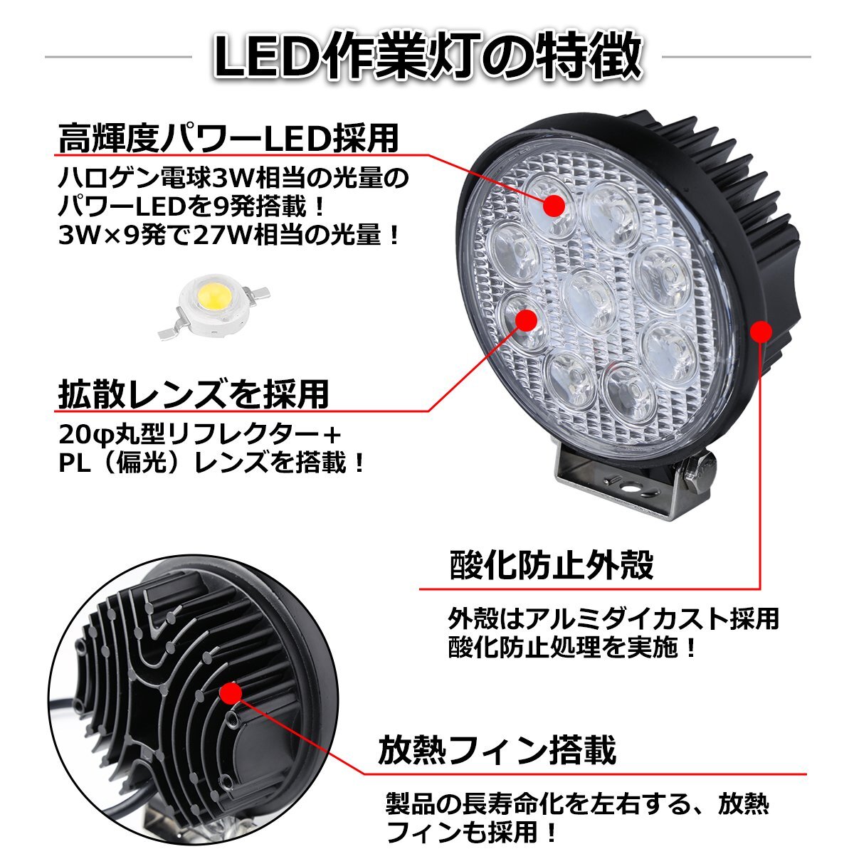3WパワーLEDを9発搭載し、小型設計でありながらしっかり路面を照らす明るさを実現 IP67の防水・防塵性能を備え素材はアルミ合金の為、高耐久で長持ち 取付はプラスとマイナスの2本の配線を電源に直接つないでボルトで固定するだけ 固定用ステー、ボルトも付属しているので、そのまま簡単に取り付け可能です ■様々な用途で大活躍 ・車に取り付けてフォグランプやバックランプに ・バイクのヘッドライトだけでは心配な夜間走行の補助灯に ・トラックに取り付けて路肩灯や夜間作業の補助灯として ・船に取り付けて夜間作業用の投光器や集魚灯として ■商品サイズ:110mm×135mm×58mm ■重量:0.6kg ■入数:2個セット ■動作電圧:DC10~30V ■色温度:約6500K ■照射角:120度 ■光束:1755lm ■保護等級:IP67 |