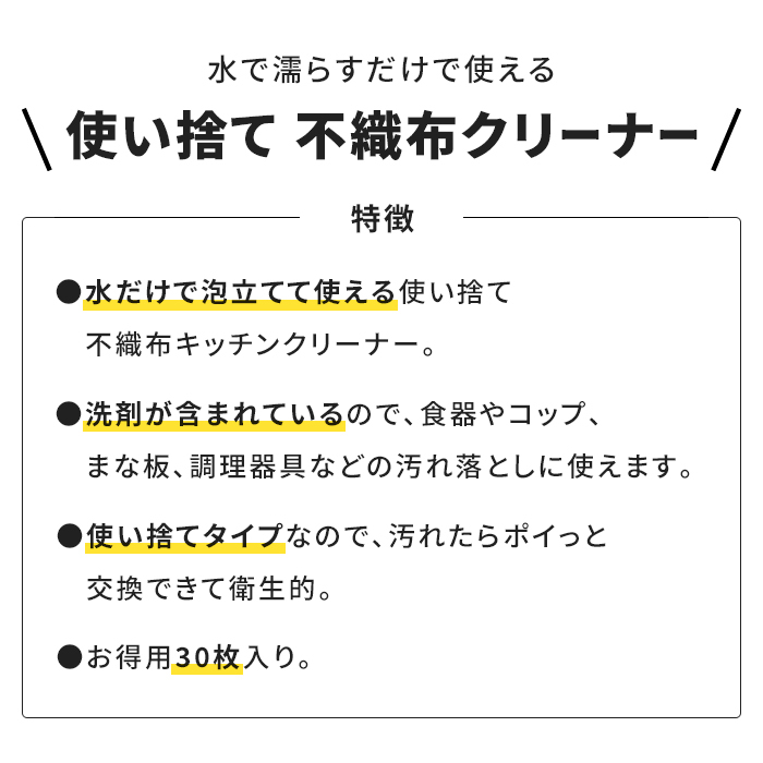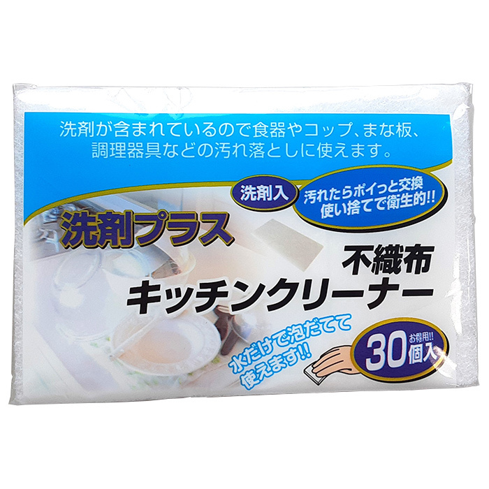 ・洗剤入り不織布キッチンクリーナー ・水だけで泡立てて使えます。 ・使い捨てで衛生的。 ・お得用30枚入り |