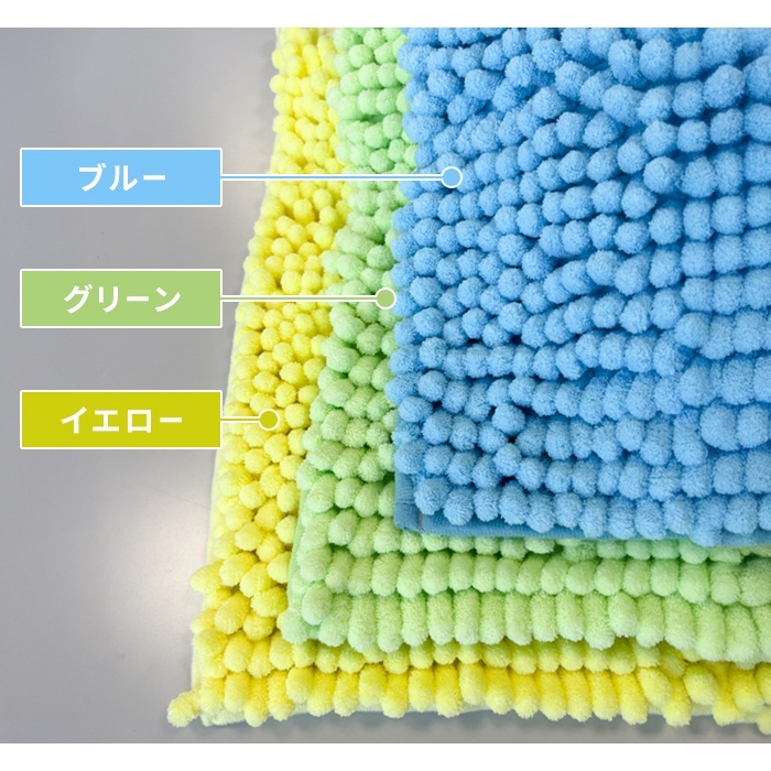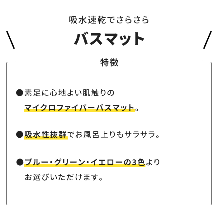| 素足に心地よい肌触りのバスマット。 吸水性抜群でお風呂上りもサラサラ。 ブルー・グリーン・イエローの3色よりお選びいただけます。です。 |