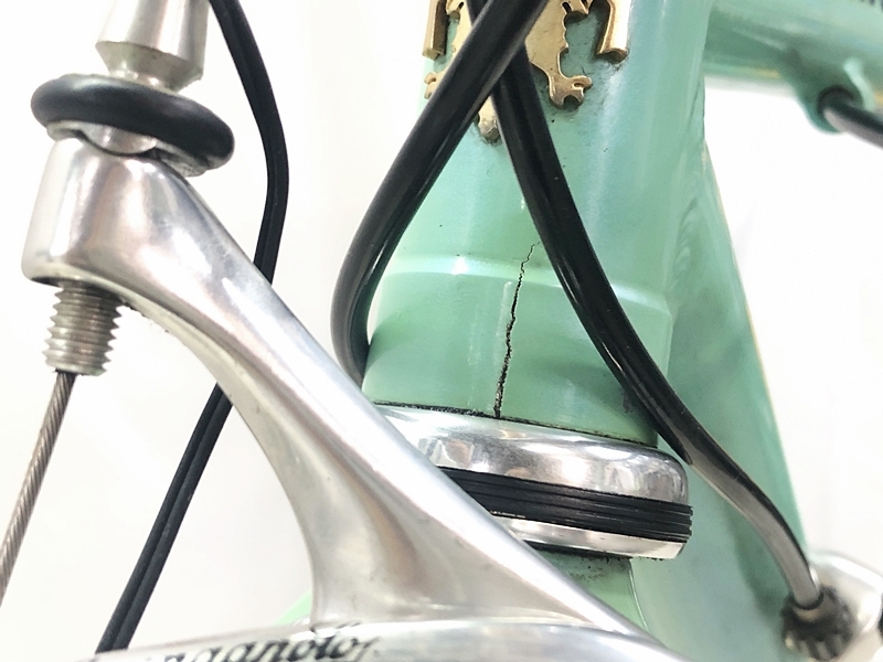 ダウンチューブ右に凹みキズがあります。フレーム全体、全てのパーツにキズやスレキズ、汚れやサビがあり、非常に強い使用感が感じられる車体です。