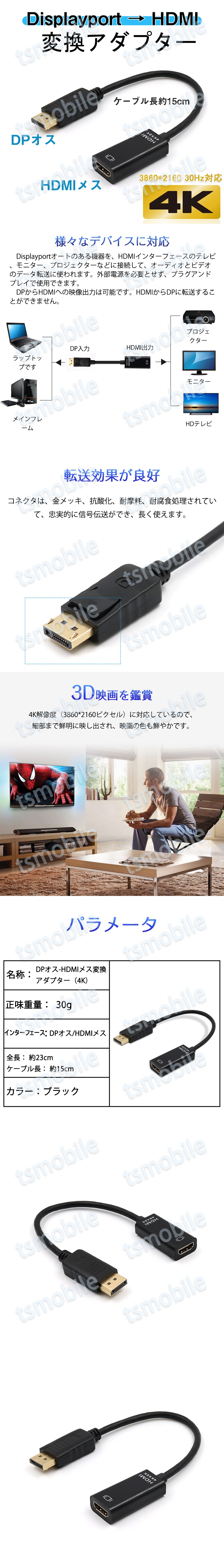 Displayportオス to HDMIメス変換ケーブル 長さ:15cm3D 4K映像サポートパソコンとモニター、ディスプレイ、プロジェクター、テレビーなどの接続に使われます。ディスプレー複製。大画面でパソコンの内容を表示して、より鮮明な映像を楽しむことができます。プラグ&プレイで、HDの大画面を楽しむことができます。ソフト不要、即時使用。オーディオとビデオの同時出力対応。PCからTVへの音声・映像のロスレス伝送を実現。太い導線で転送スピードが速い、断線しにくい、耐久性と安定性が評価されています。注意:DP→HDMIの単方向転送のみ対応しています。