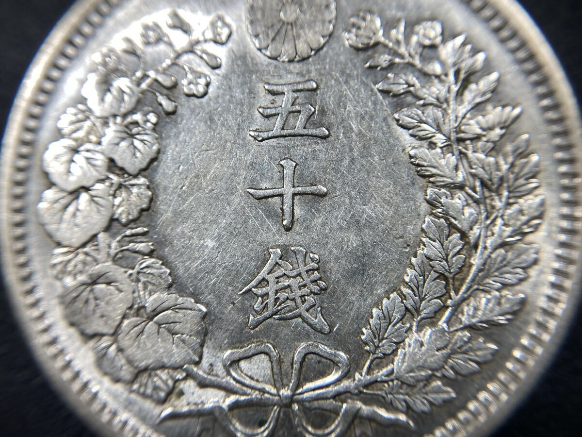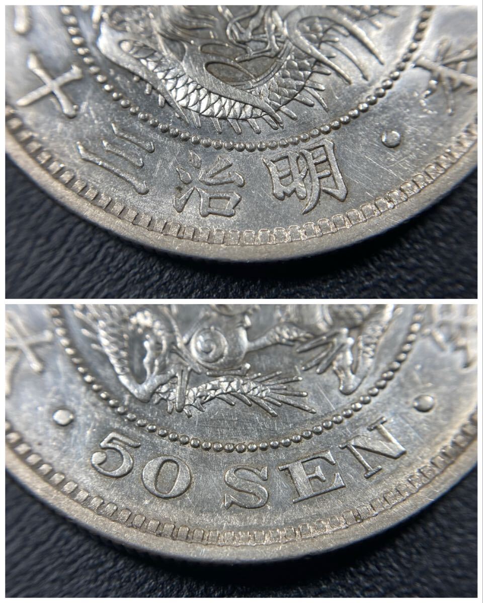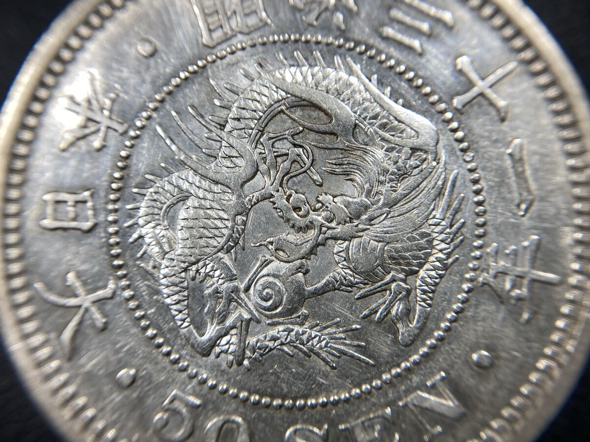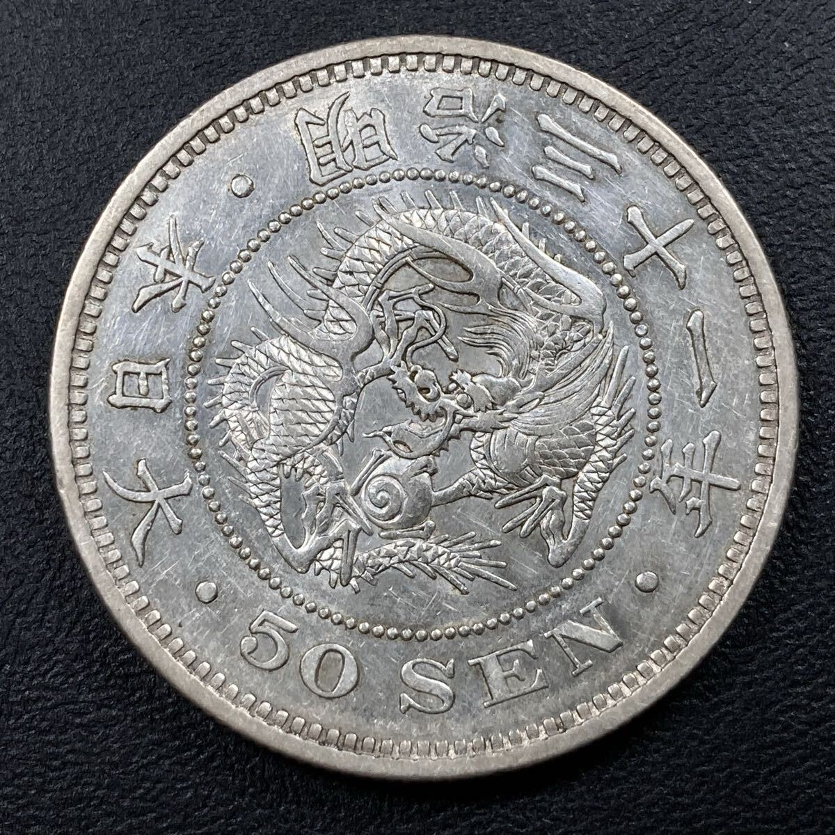 こちらは入手時極美品の竜50銭銀貨の明治31年になります。