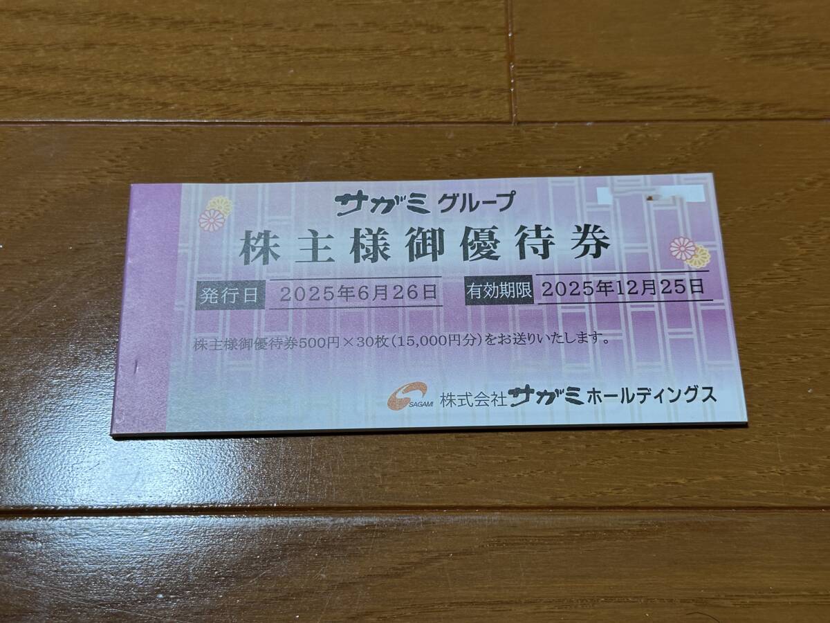 サガミホールディングスの株主優待券15,000円分(500円×30枚)です ○ 有効期限は2025/12/25 ○ サガミホールディングスグループ各店で使用できます ○ クリックポストで発送の予定です ○ 送料は当方で負担させて頂きます
