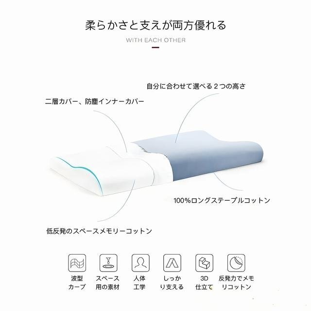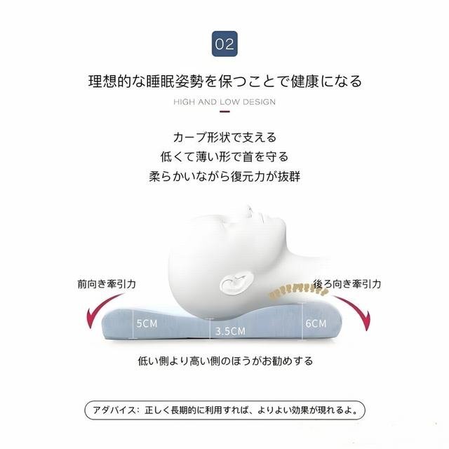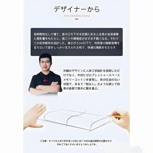 ●高さが5cm以下で、利用者の睡眠習慣を変えないで首をしっかり支えられる枕で、快適な睡眠をもたらす 外観のデザインに人体工学設計を採用しただけでなく、中材にゼロプレッシャースペースメモリーコットンを使用し、体が圧迫のない状態で、「枕なし」のような感じで効果が抜群で意外に驚き喜ぶ。