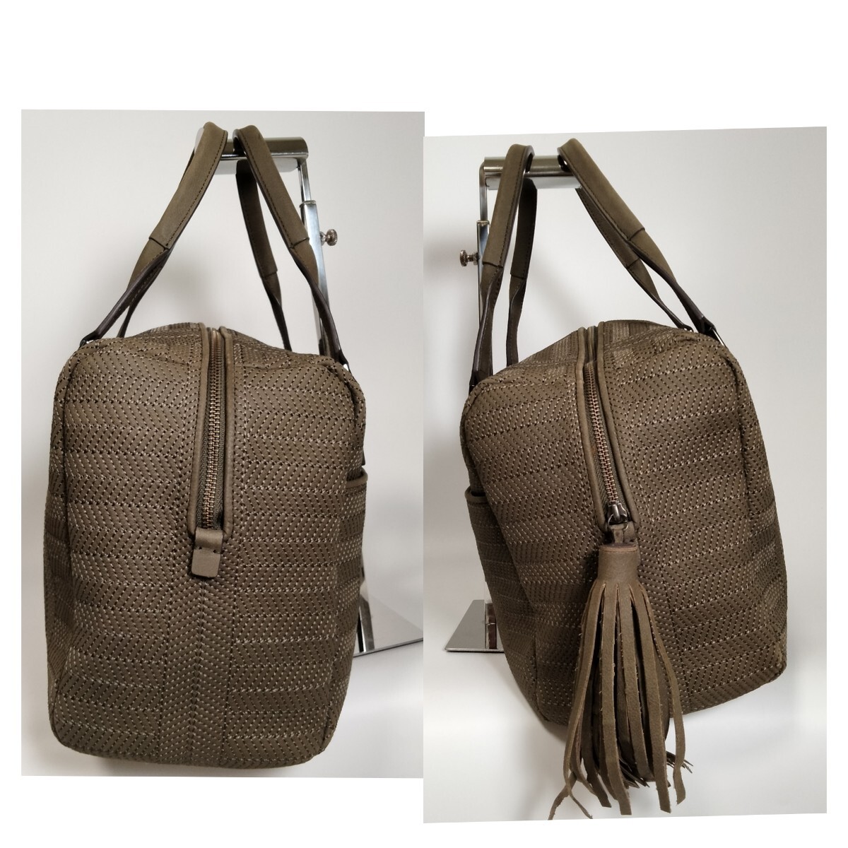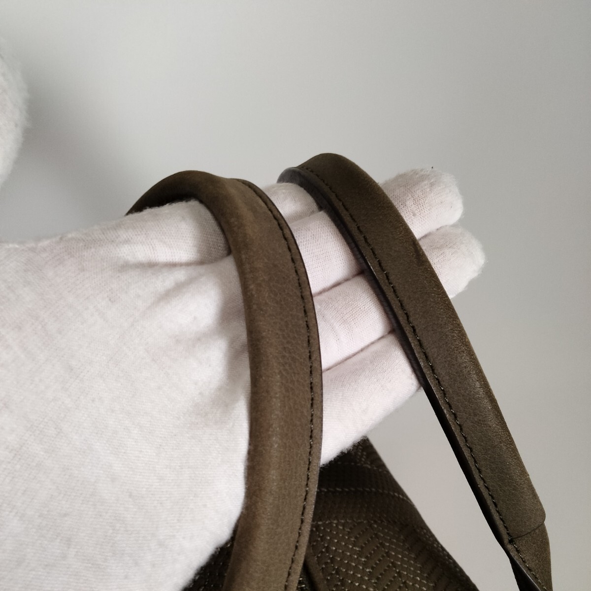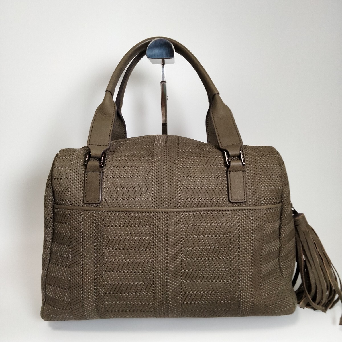 落ち着いたオリーブカラーのテキスタイルに、上品な光沢を放つレザーのハンドルやトリミングが施され、大人の女性にふさわしい落ち着いた雰囲気を醸し出しています。