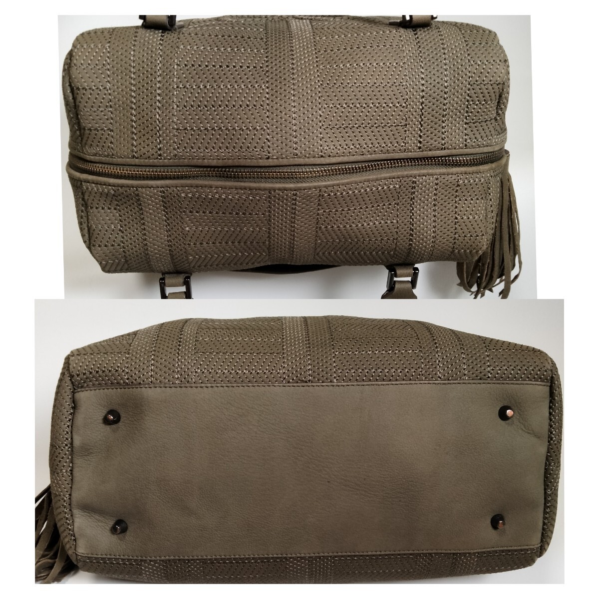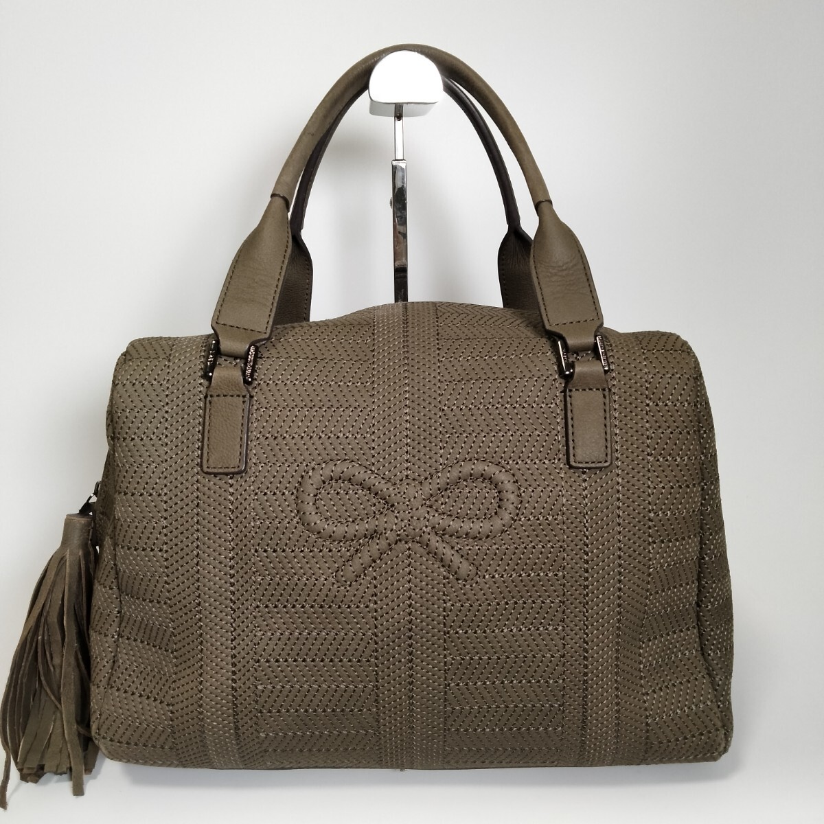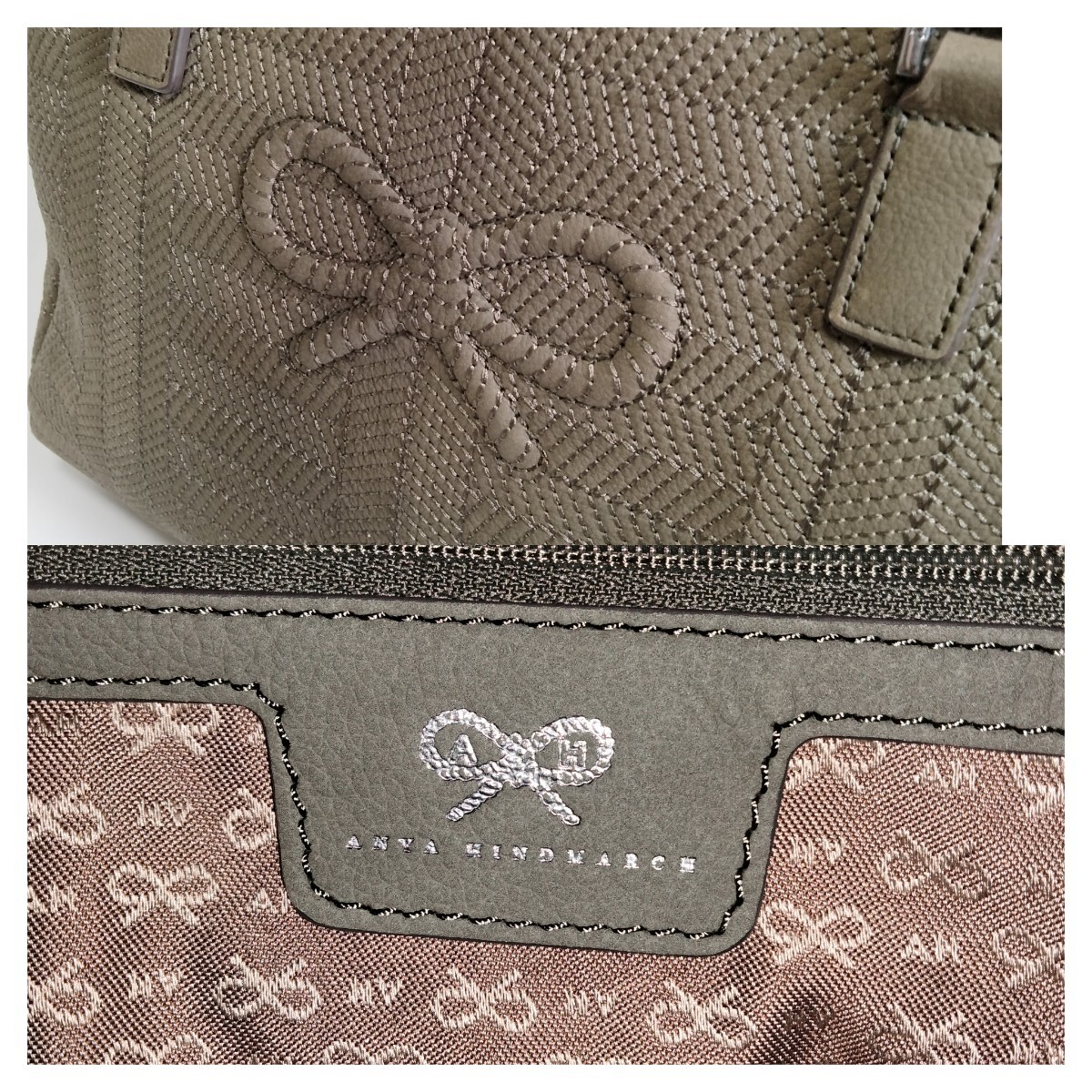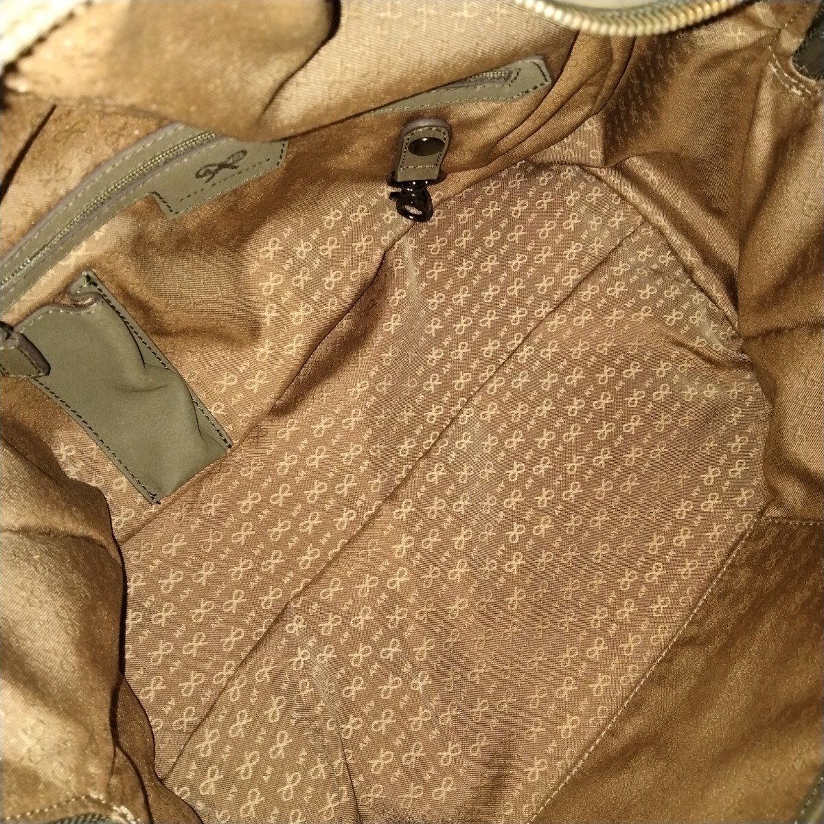 落ち着いたオリーブカラーのテキスタイルに、上品な光沢を放つレザーのハンドルやトリミングが施され、大人の女性にふさわしい落ち着いた雰囲気を醸し出しています。