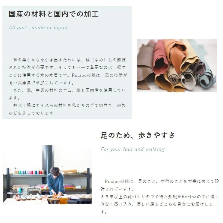 Vカットのトップラインが脚を美しく見せ、ヒール無しでも上品な印象に。 深めの履き口の為、親指小指の付け根も柔らかく包み込みます。 外反母趾傾向が気になる方にもオススメのデザインです。 さっと履けて脱げにくく、つい毎日選びたくなる1足です。 ●ビジネスやフォーマルにも使えるきちんと感。 ●快適な履きこごちとキレイ見えを両立。 ●柔らかい足あたりのソフトレザーを使用、履くごとに足に馴染みます。 ●甲深で足をしっかりと包み込みます。外反母趾傾向が気になる方にも。 ●手を使わずさっと履けて、脱げにくい。 ●肌寒い時期は靴下を合わせてカジュアルなコーディネートもお楽しみ頂けます。 ※こちらは革製品の為、性質上新品であっても多少のシワや細かなキズなどがある場合がございます。 恐れ入りますがご理解、ご了承のほどよろしくお願い申し上げます。 Recipe(レシピ)の靴は、足のこと、歩行のことを大事に考えて設計されています。 全ての材料を日本国内で調達・加工。 65年以上の靴づくりの中で得た知識をRecipeの中に惜しみなく盛り込み、優しい履きごこちを貴女にお届けします。 |