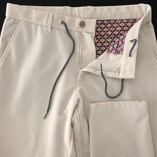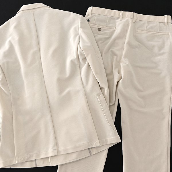 | 新品 未使用 紙タグあり 46サイズ(Mサイズ相当・画像は別サイズで撮影) ※商品に記載されたサイズ・寸法です※ 【ジャケット】 肩幅45cm 身幅51cm 袖丈60cm 着丈69.5cm 【パンツ】 ウエスト実寸80~86cm(内回り1周・ゴム入り) 股上25cm 股下75cm 裾幅17cm 腿幅27.5cm(股下10cm部分) ※伸縮性がある素材のため多少誤差が生じることがあります※ 表地:ポリエステル89% ポリウレタン11% 裏地:綿100% オフホワイト系 |