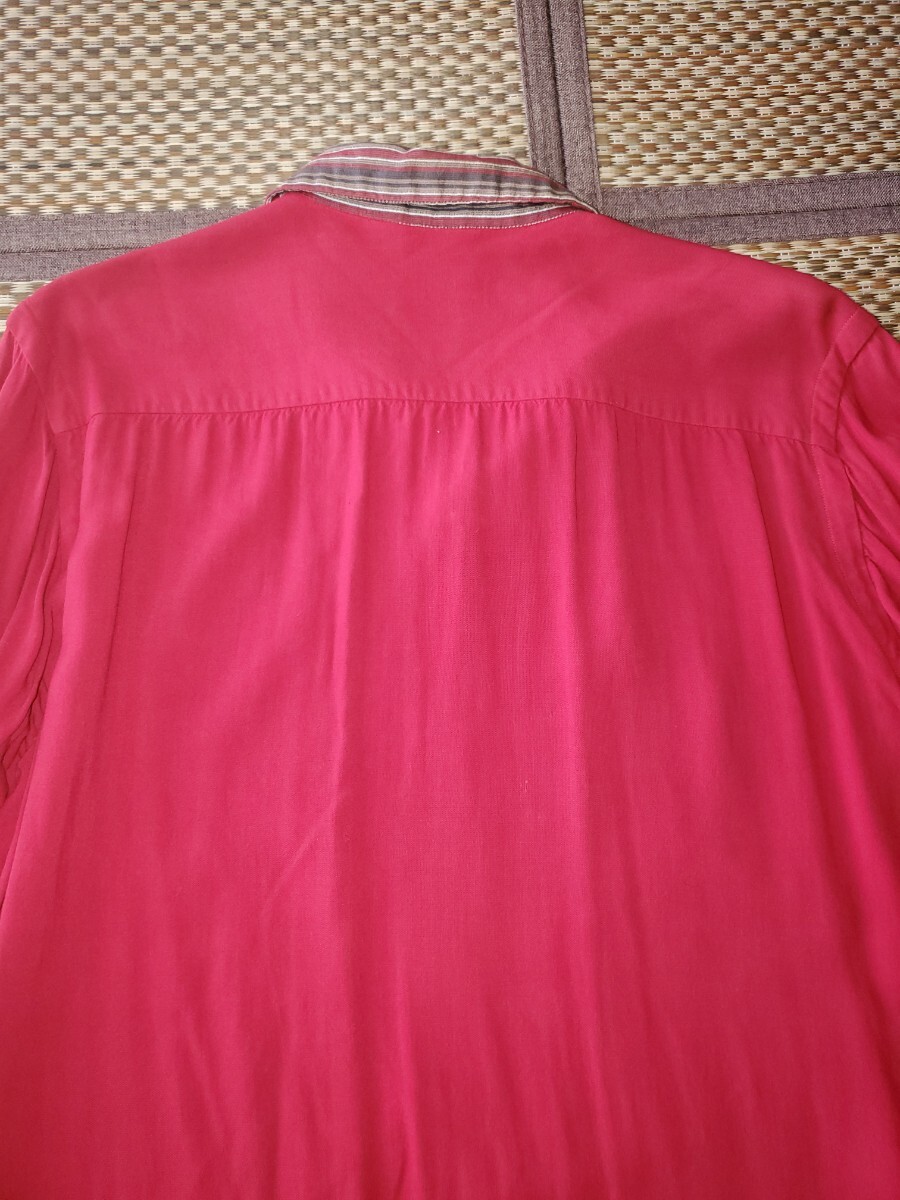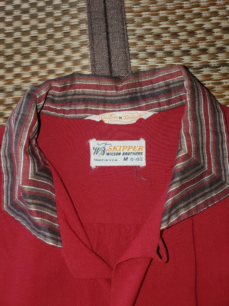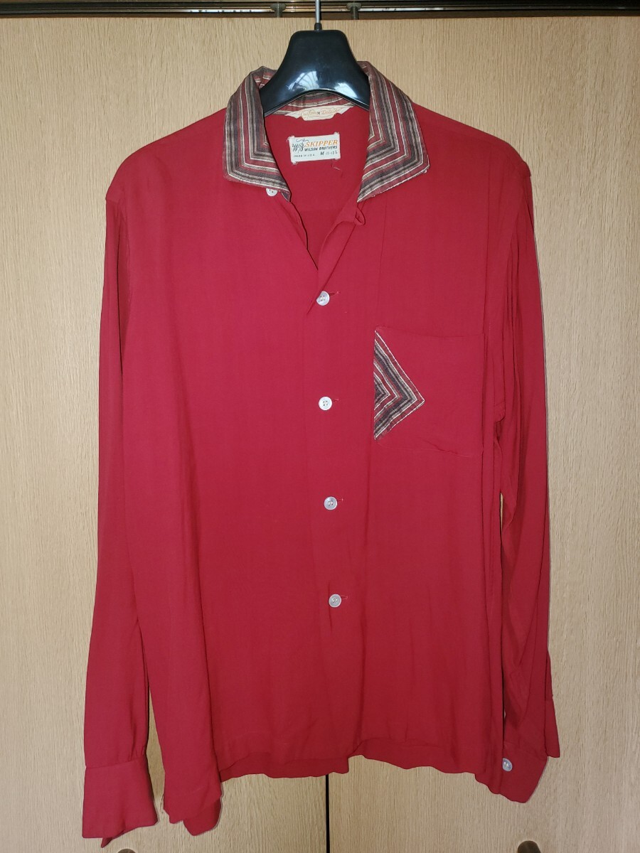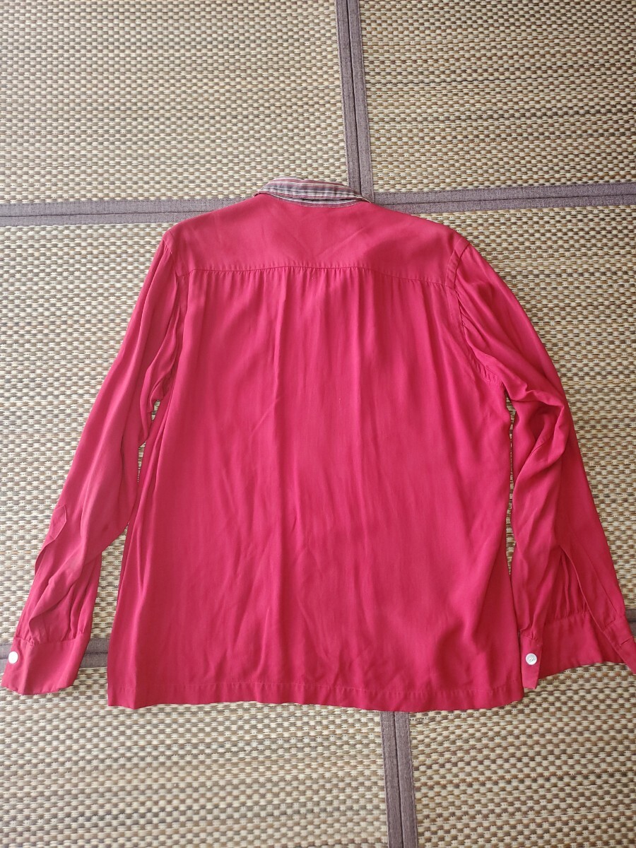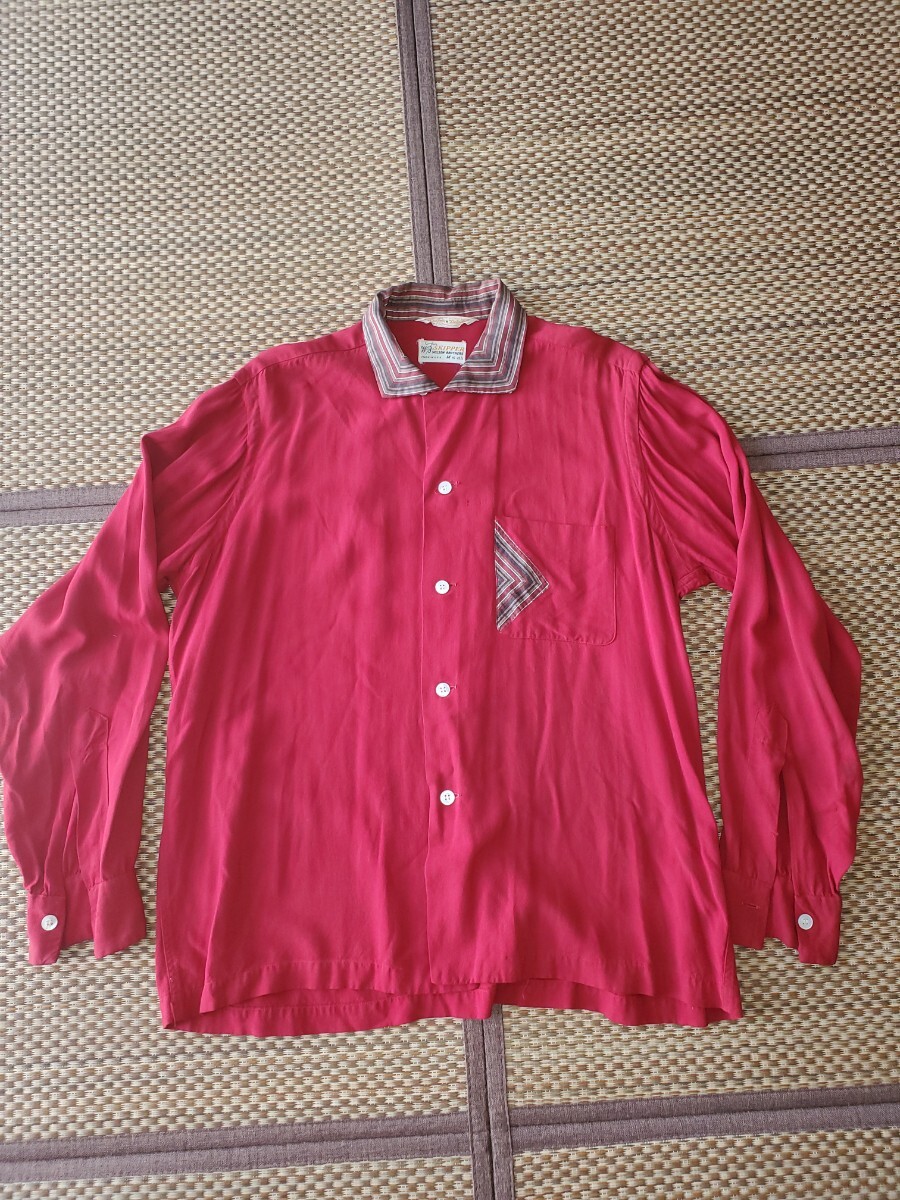 1950後半から60年代初頭にかけてのレーヨンギャバシャツになります。画像では赤っぽく見えますがワインレッドです。ボタンは全てオリジナルで襟はイタリアンカラー、背中のギャザーが当時の流行です。表示サイズはM、15~15ハーフ。実寸で肩幅43、身幅56、袖丈60、着丈67.5くらいです。M~Lくらいの感じです。左袖あたりに汚れが2ヵ所ありますがワインレッドなのでそこまで目立たないです。あとは特にダメージも無くビンテージシャツとしては程度は良いと思います。これからの季節にいかがでしょうか?