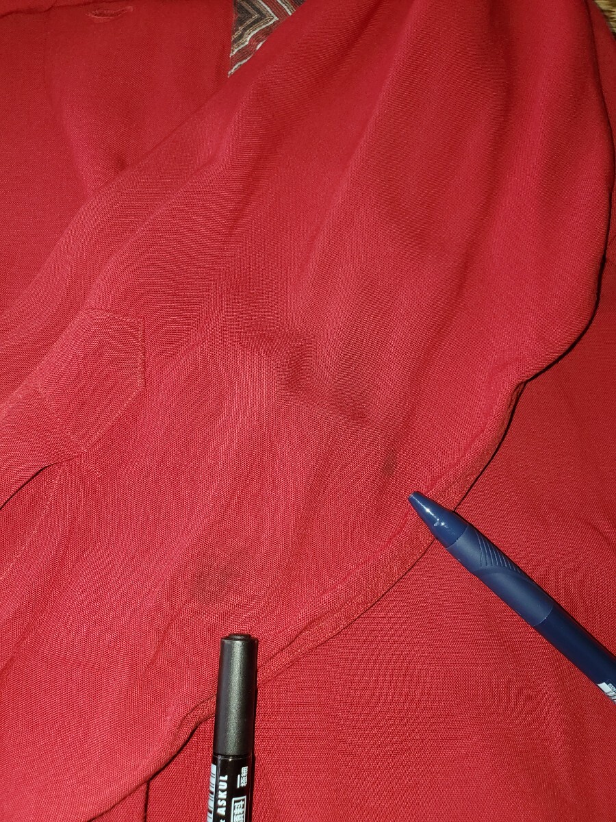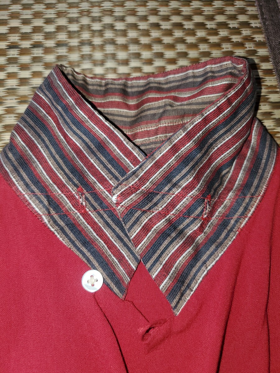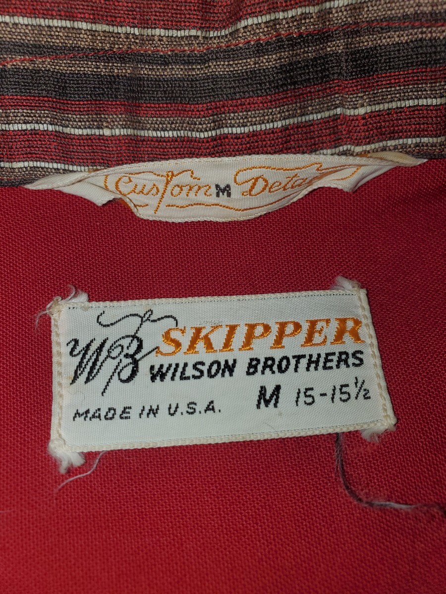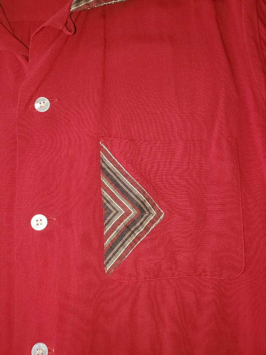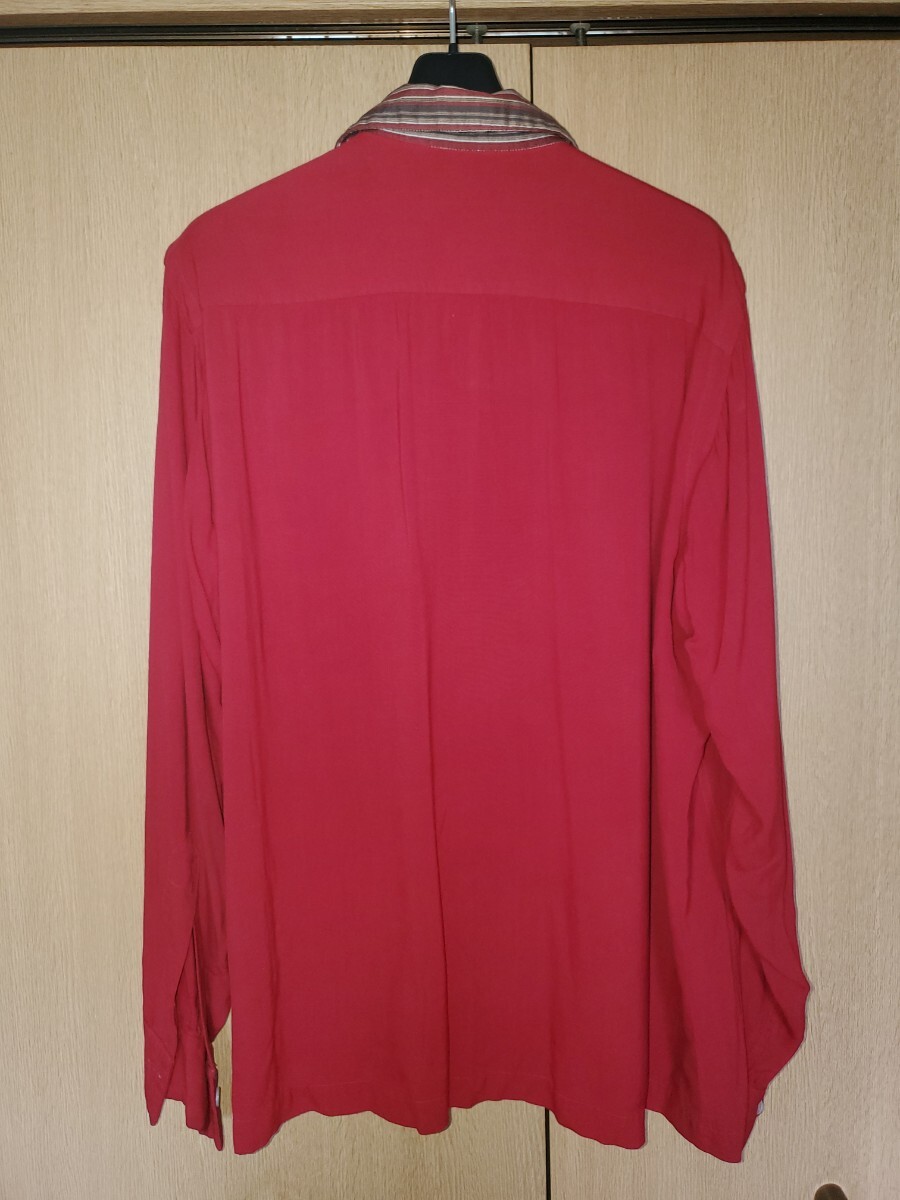1950後半から60年代初頭にかけてのレーヨンギャバシャツになります。画像では赤っぽく見えますがワインレッドです。ボタンは全てオリジナルで襟はイタリアンカラー、背中のギャザーが当時の流行です。表示サイズはM、15~15ハーフ。実寸で肩幅43、身幅56、袖丈60、着丈67.5くらいです。M~Lくらいの感じです。左袖あたりに汚れが2ヵ所ありますがワインレッドなのでそこまで目立たないです。あとは特にダメージも無くビンテージシャツとしては程度は良いと思います。これからの季節にいかがでしょうか?