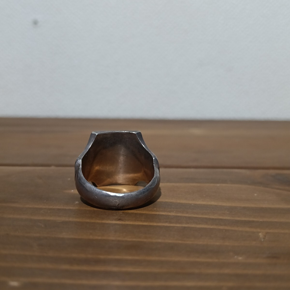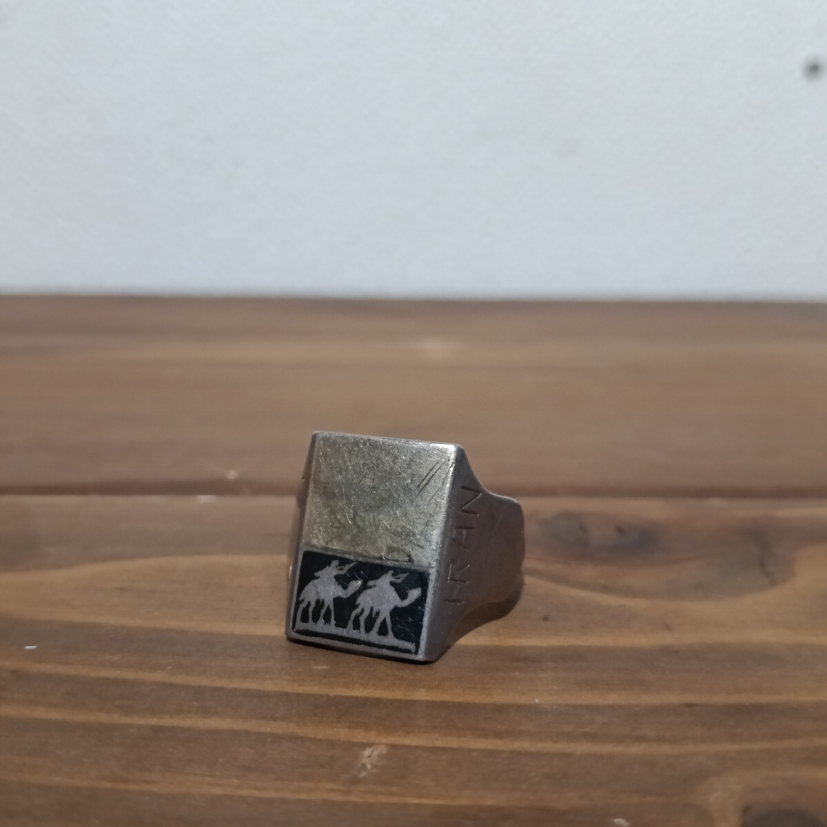 1945年製のイランのシアターメイドリングです。当時の軍務を象徴する2頭のラクダが描かれています。大戦時に中東に軍を派遣していたのは、アメリカではなくイギリスなので、おそらくイギリスのものだと思います。コレクターの方も多いと思いますので、今後も価値が高まっていくと思います。サイズは大きめなので、親指、中指、人差し指に合う方が多いと思います。素材はシルバー925ということで購入しました。