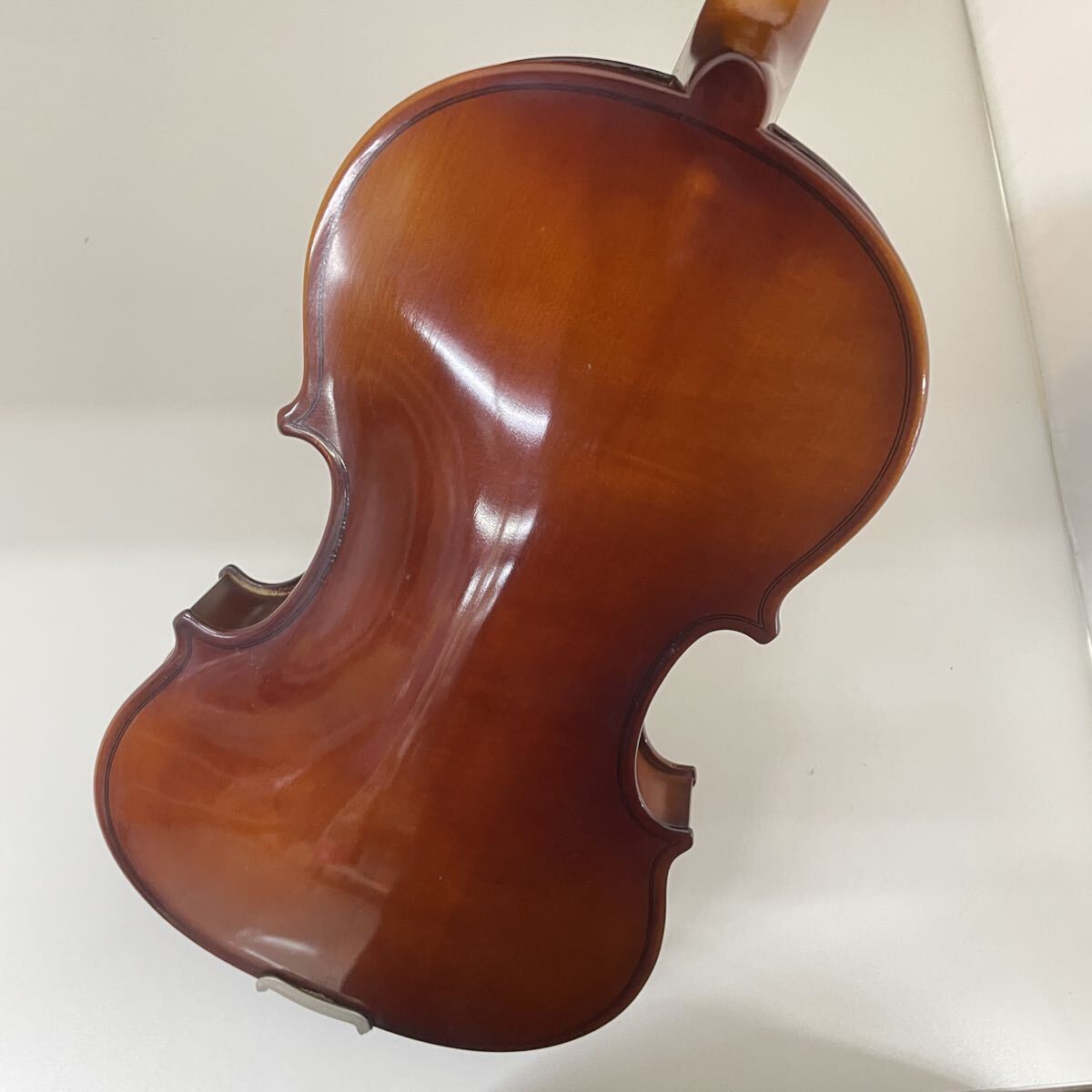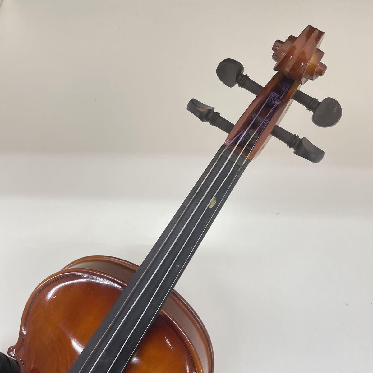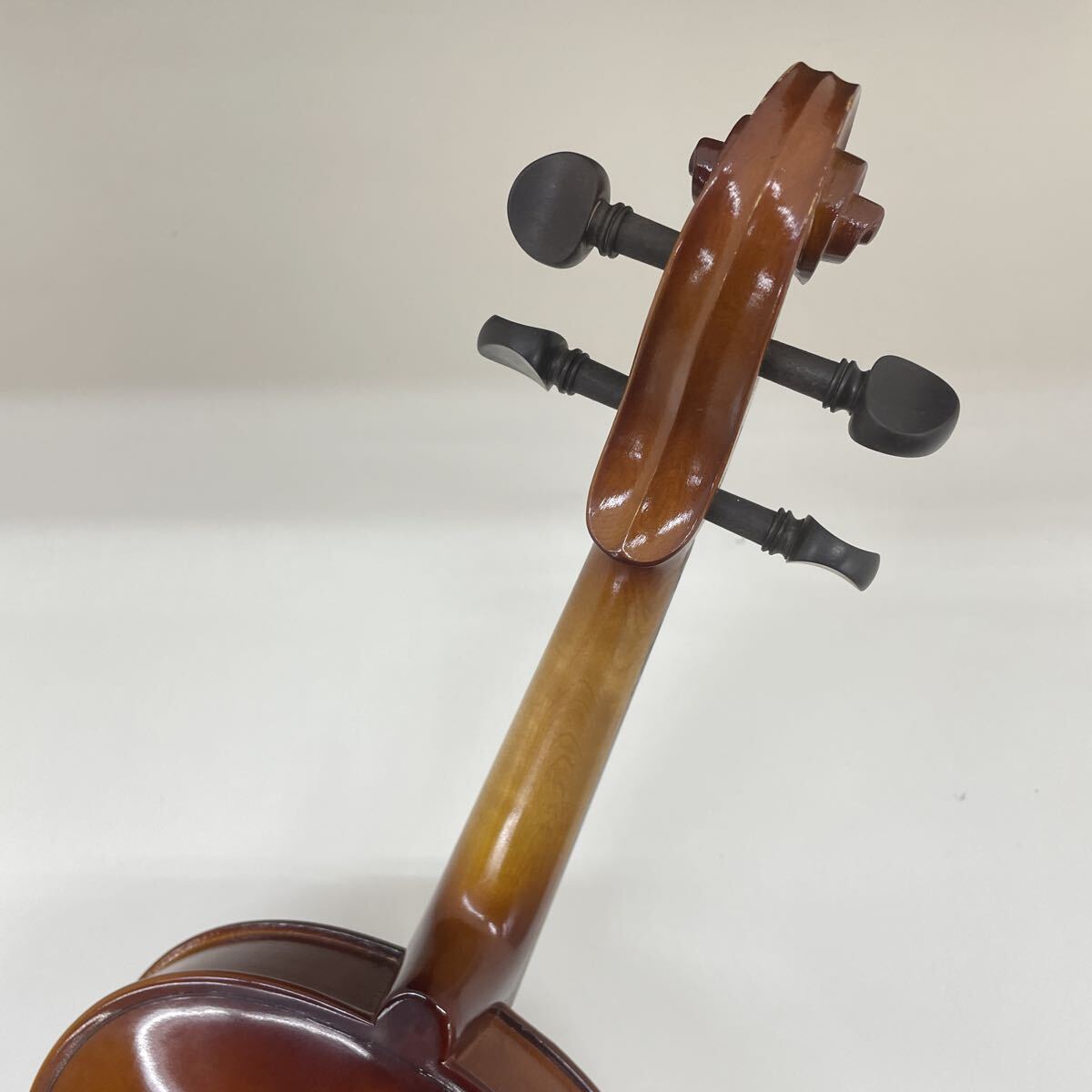 箇所によって汚れがあり、ペグ1つが色褪せがあります。また、緒止めに傷があり、指板にシールが貼られています。他に目立った傷がなく、魂柱は立っています。胴長約53cm