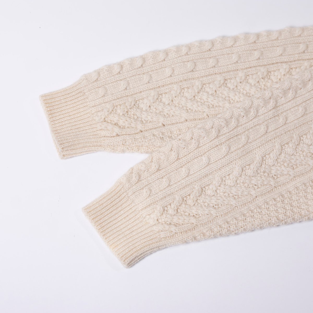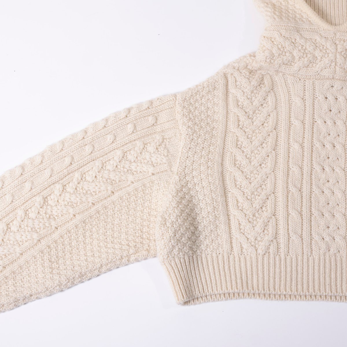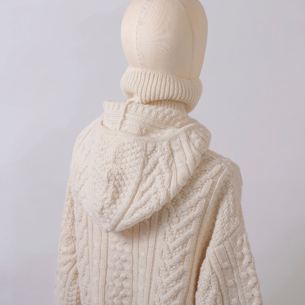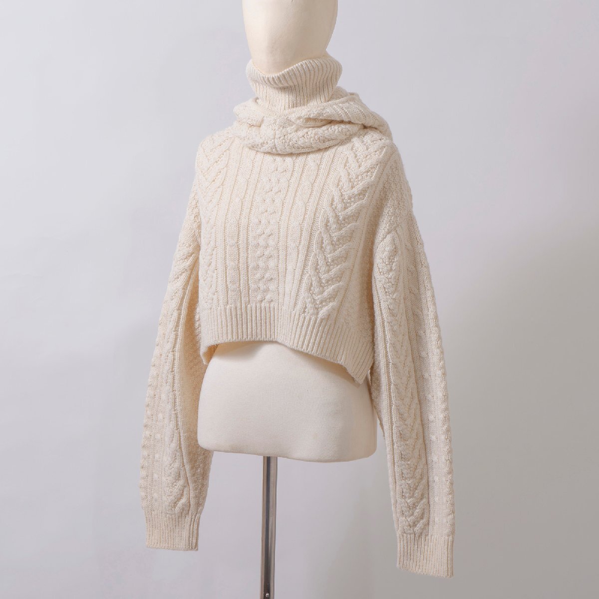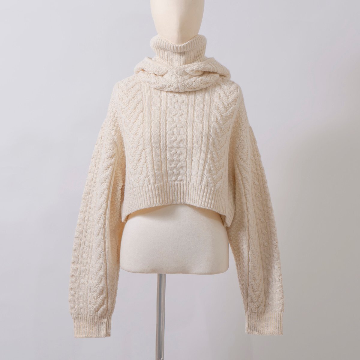 本品はふっくらとしたケーブル編みが特徴的なタートルネックニット。ショート丈とボリュームスリーブ、ハイネック×フードのドッキング構造がモードな印象を与えます。 柔らかなウール素材の上質な温もりで、日常から特別なシーンまでラグジュアリーなスタイルを演出します。 ■おすすめのコーディネート