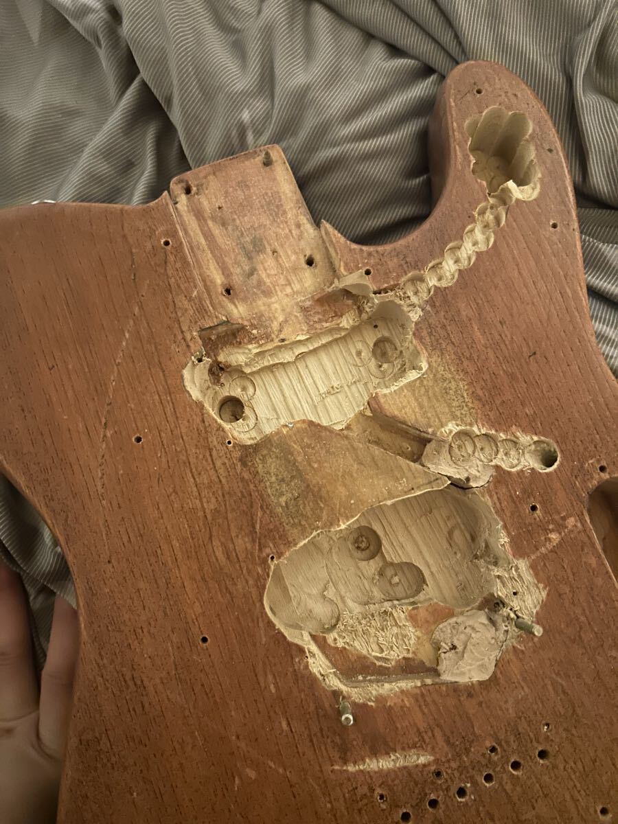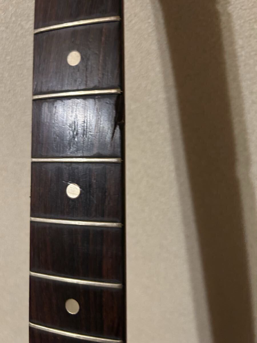 ロックナットを付けていた形跡があり、素人作業ですがローズウッドで当て木されています。