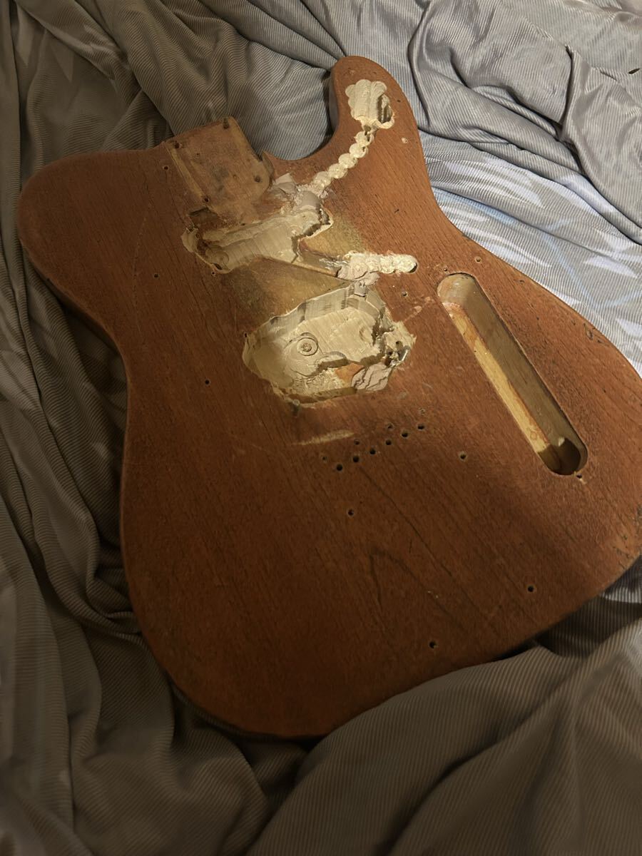 (台形プレートを使わない場合、通常のテレキャスターブリッジやビグスビータイプのプレートを代用してもザグリはギリギリ隠せると思います。)