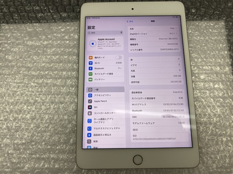 EL865 SIMフリー iPad mini 第5世代 Wi-Fi+Cellular A2124 シルバー 256GB ジャンク ロックOFF