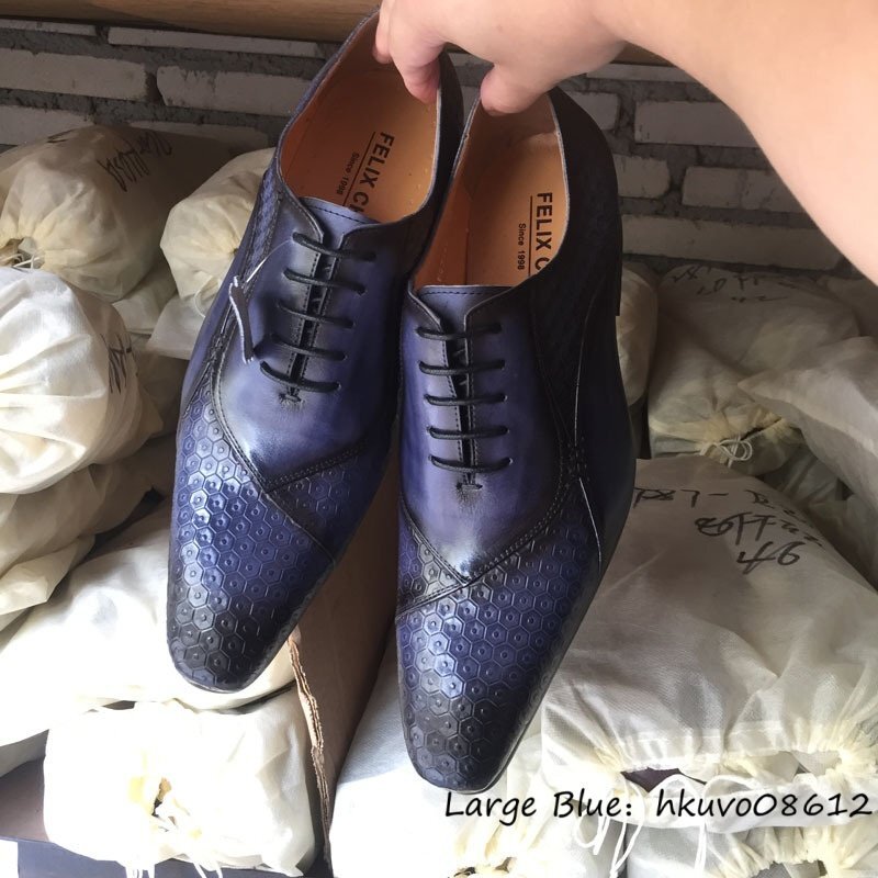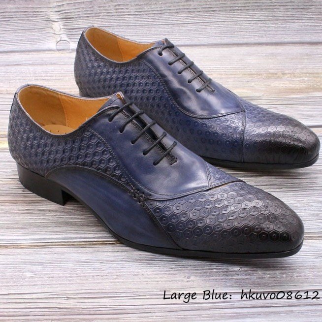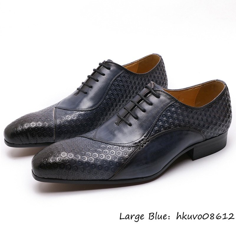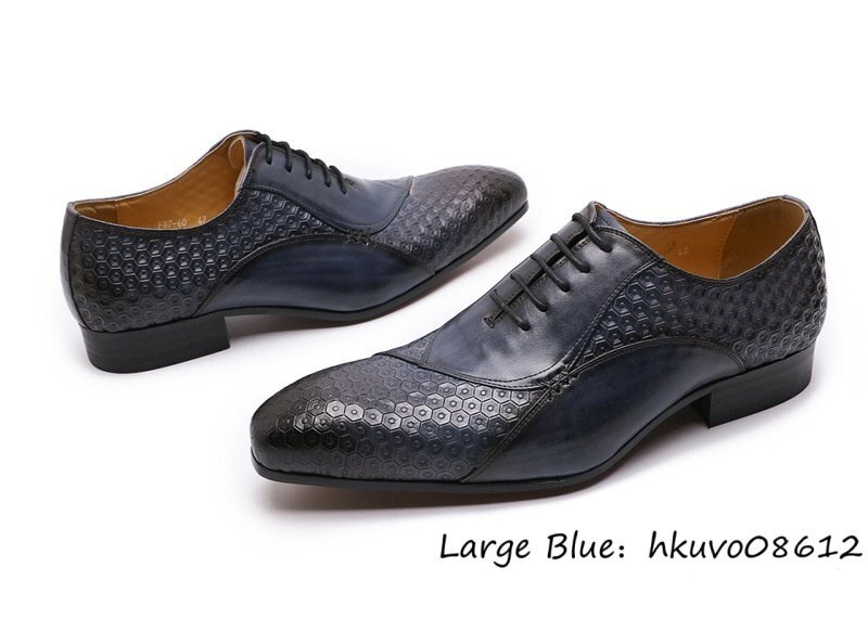 超希少■レザーシューズ メンズ ドレスシューズ 本革 職人手作り 押し柄 ビジネスシューズ 高級牛革 革靴 紳士靴 冠婚葬祭 ブルー 25.0cm