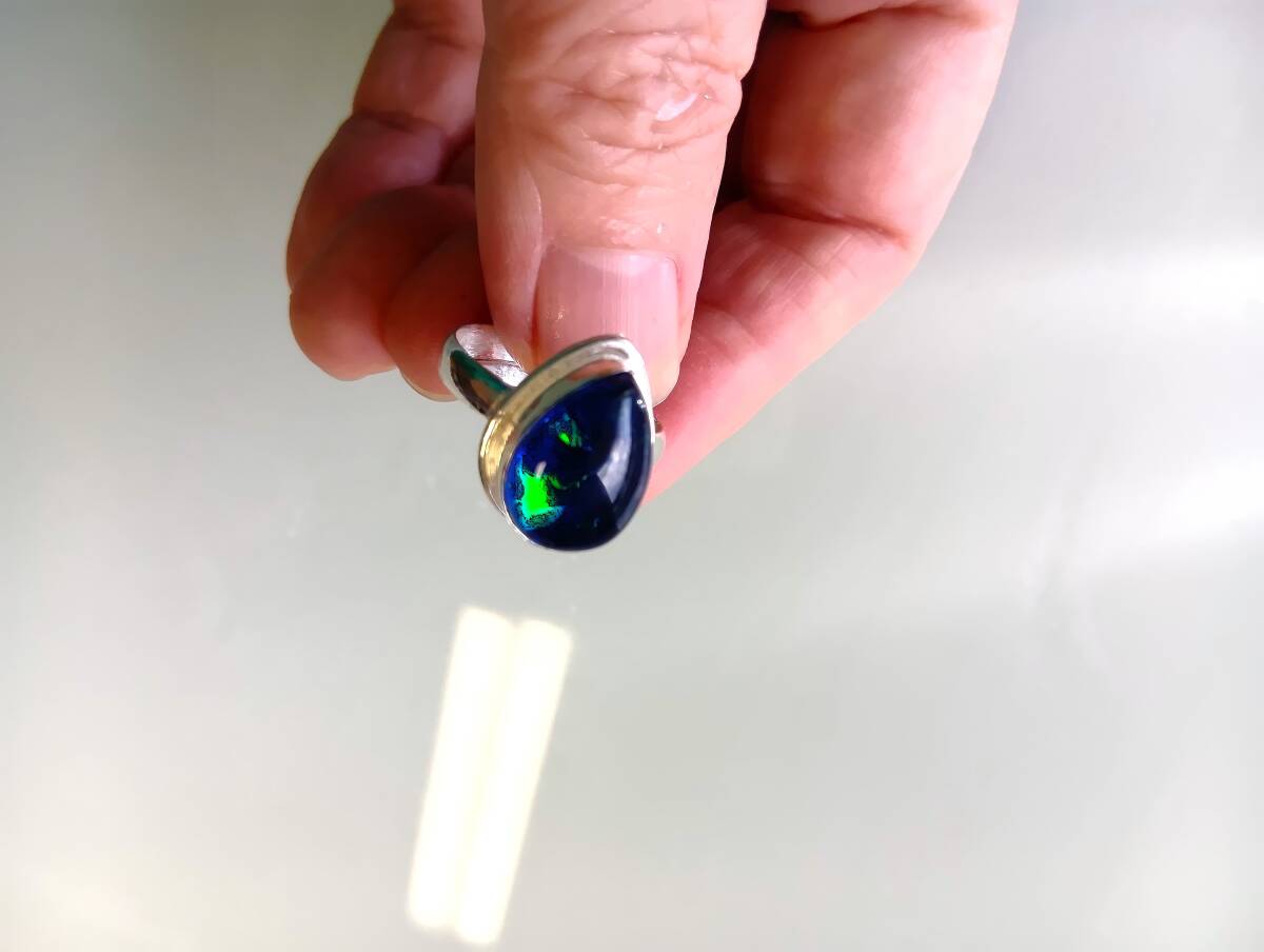 オパール リング サイズ調節自由 すぐにお届け。ブルーグリーントリプレットオパールジェムストーン925シルバーハンドメイドジュエリー