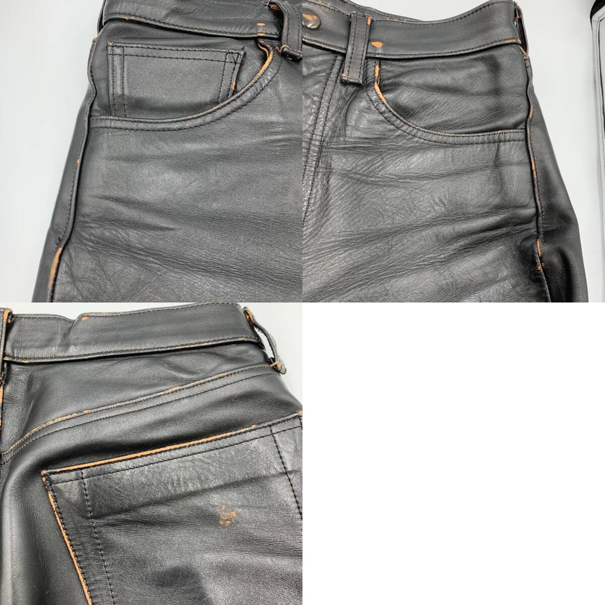中古です。 全体的に擦れ、シワなど市予感があります。 左裾付近に白色の汚れがあります。 レザーの剥がれなどのダメージは、仕様になっているため画像をご覧のうえでご判断ください。 サイズ:30/約 ウエスト36、股上31、股下79、裾幅20(cm) カラー:ブラック 素材:レザー 付属品:なし  |