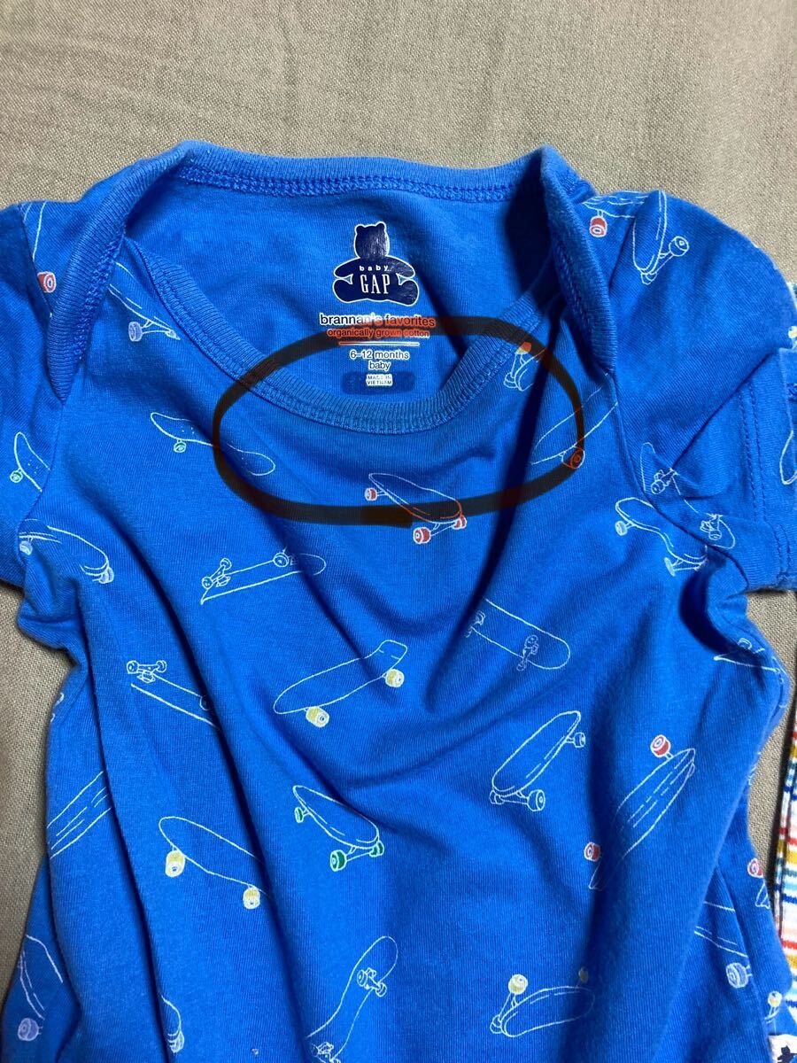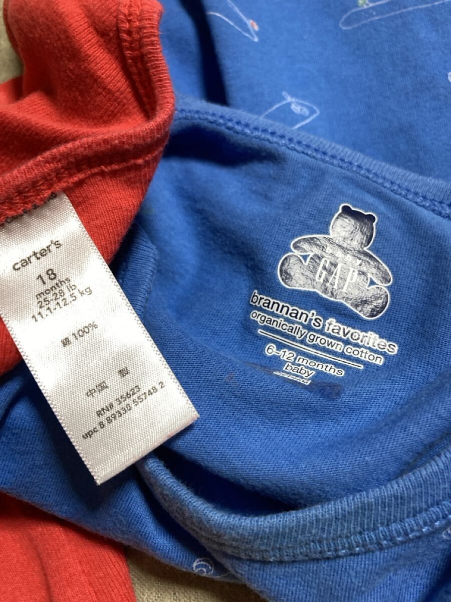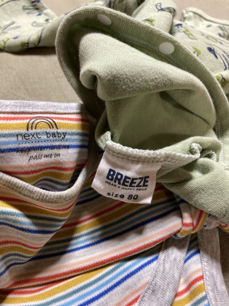 左からカーターズ、目立つダメージは無いが使用感あり。gapはよく見ると首元にうっすら汚れ、洗濯タグなし。nextbabyは首元の変色と洗濯タグなし。ブリーズはダメージなしの選択タグ無し。