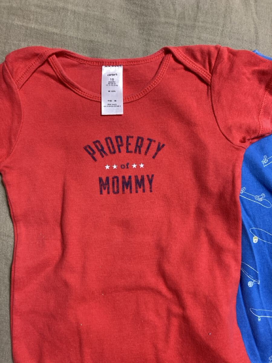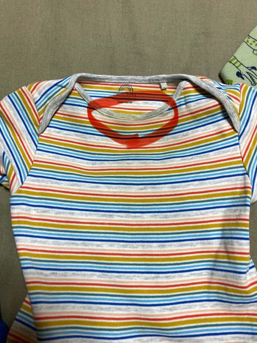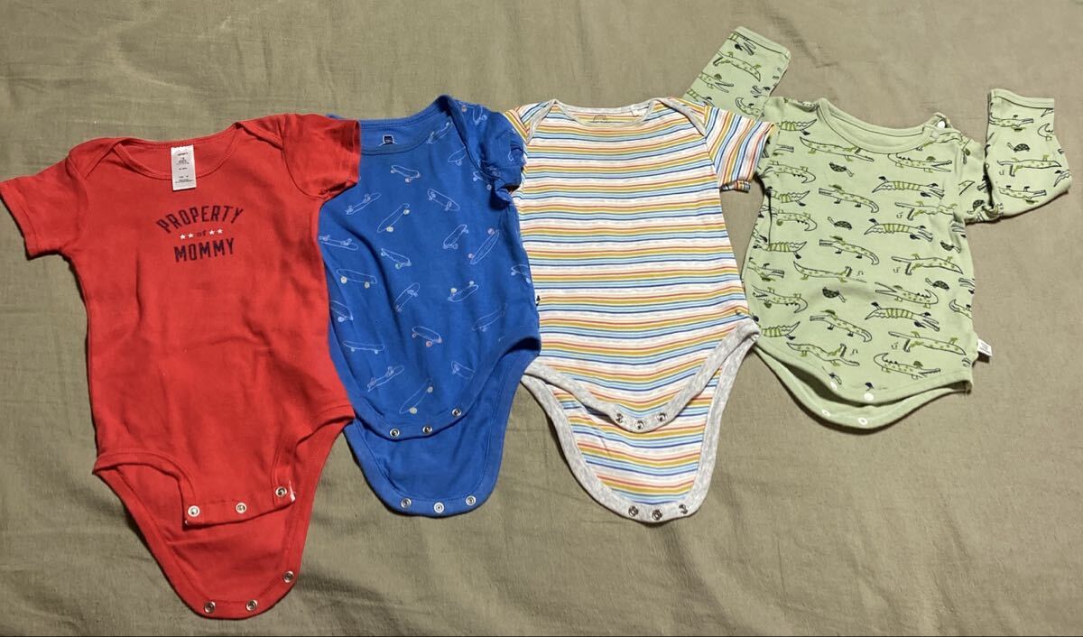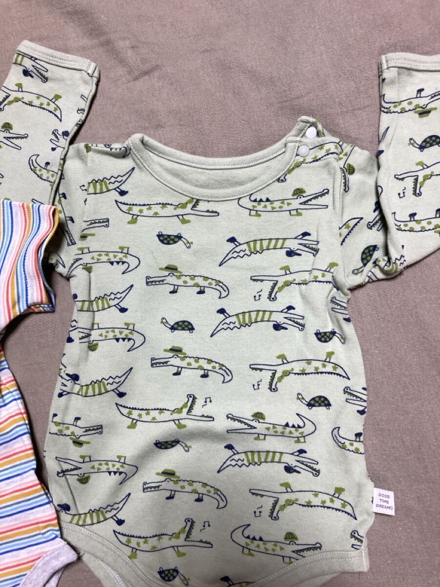 左からカーターズ、目立つダメージは無いが使用感あり。gapはよく見ると首元にうっすら汚れ、洗濯タグなし。nextbabyは首元の変色と洗濯タグなし。ブリーズはダメージなしの選択タグ無し。