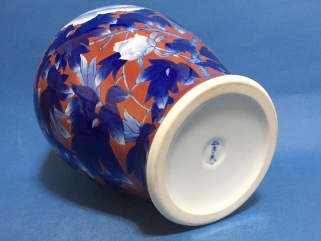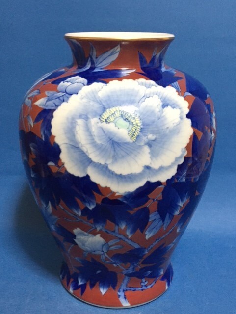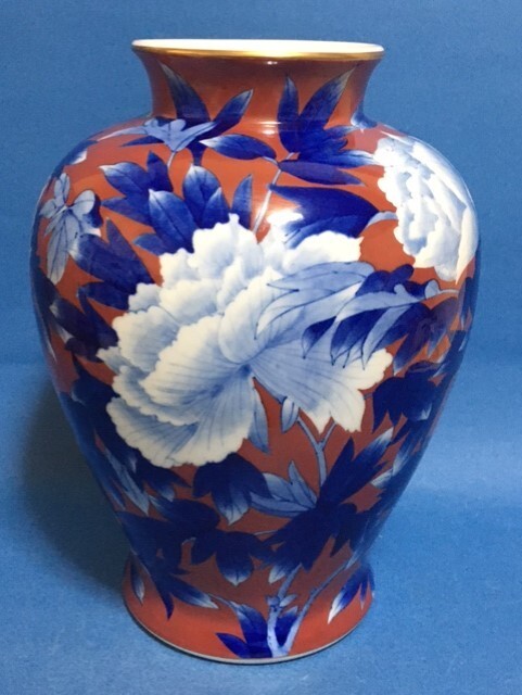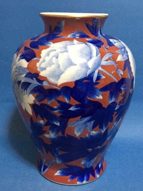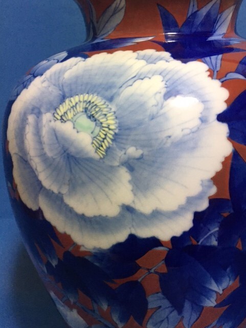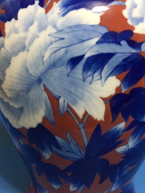 ◎深川製磁 染錦牡丹外赤 31.5cm大花瓶◎