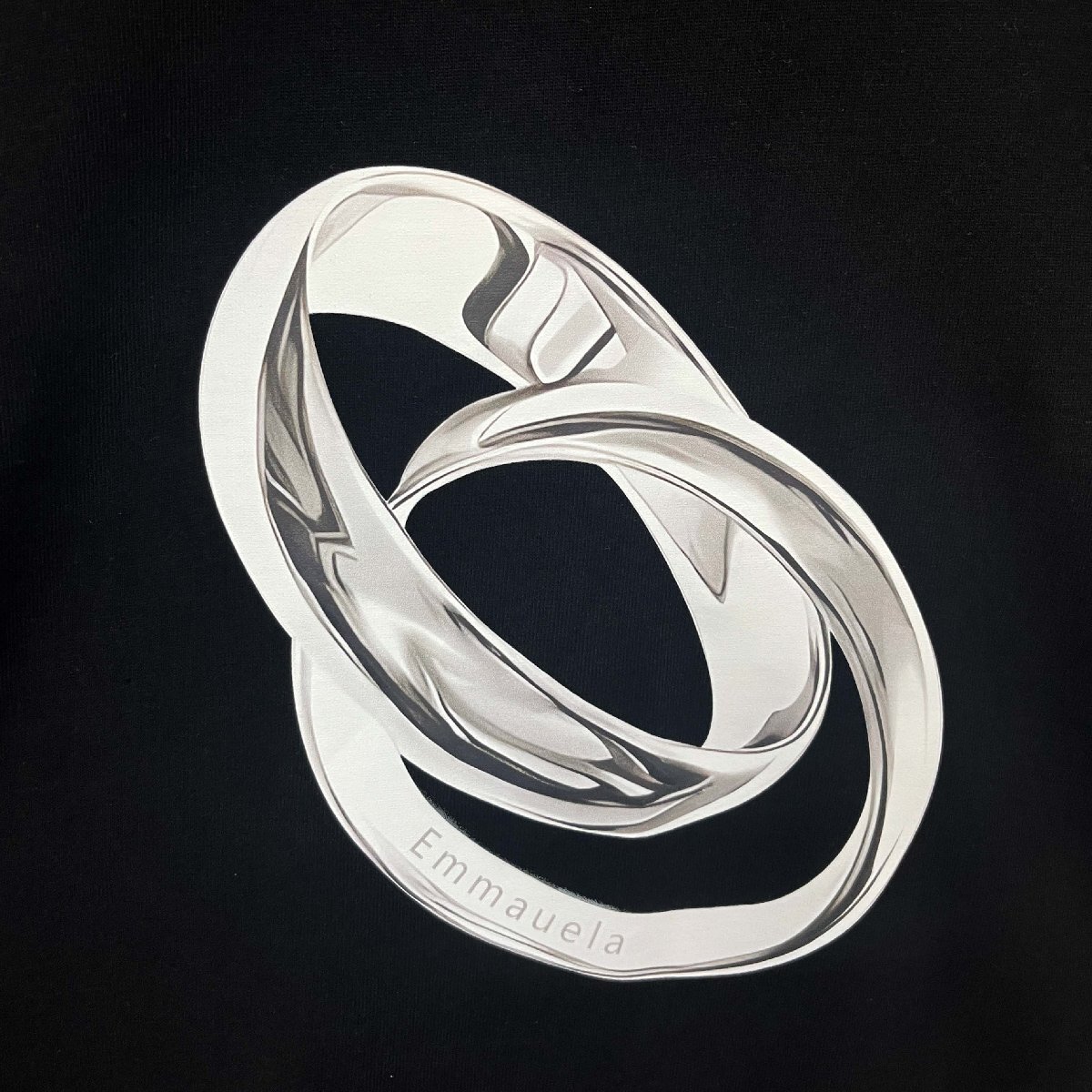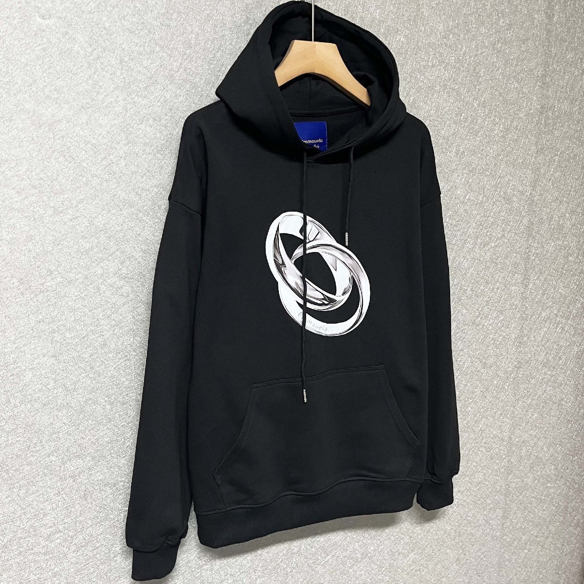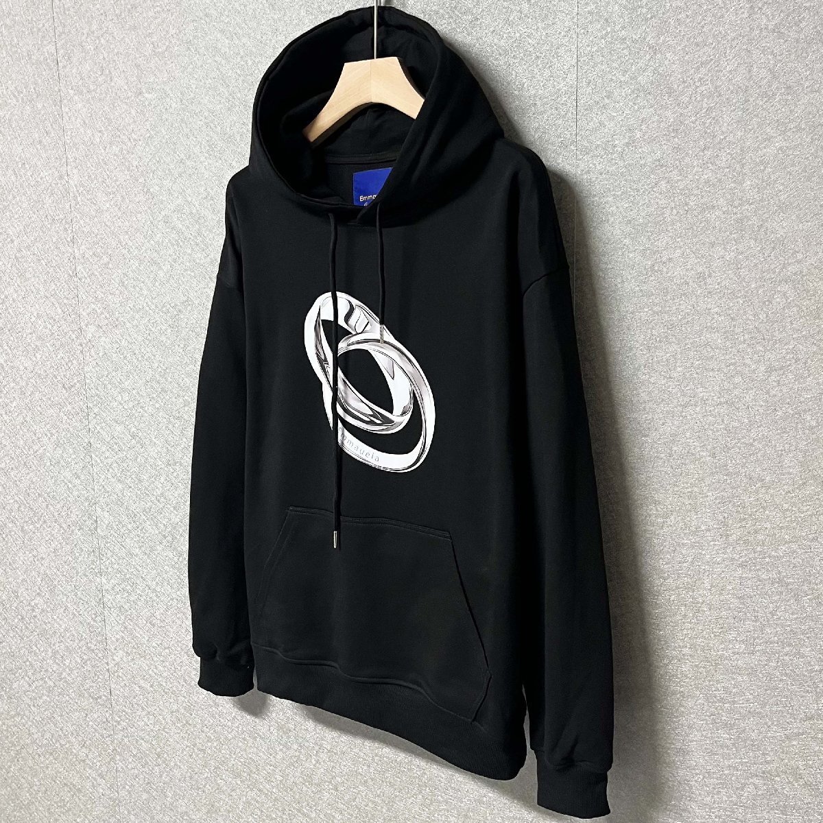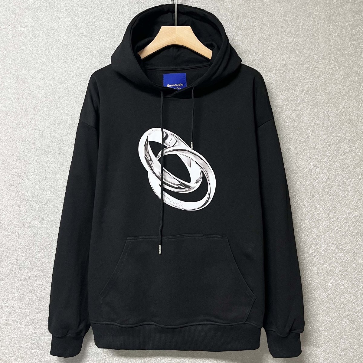 すっきりとしたシルエットとベーシックなフード付きデザインで、どんなスタイルにも合わせやすい万能アイテム。フロントにはシックなカップルリングのプリントが施されており、シンプルながらも洗練された印象を与えます。