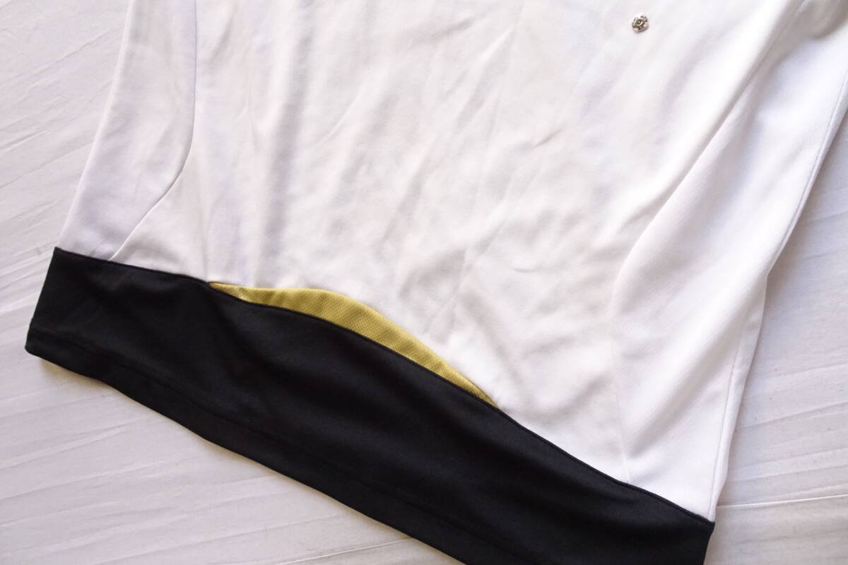 身頃脇、後袖ぐり、ゴールドパイピングライン入りです。