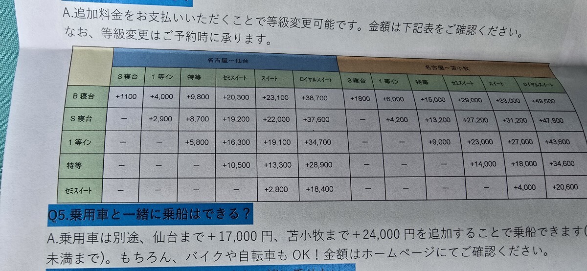 B寝台ですが差額を支払えば船室のアップグレードが出来ます。(写真参照)