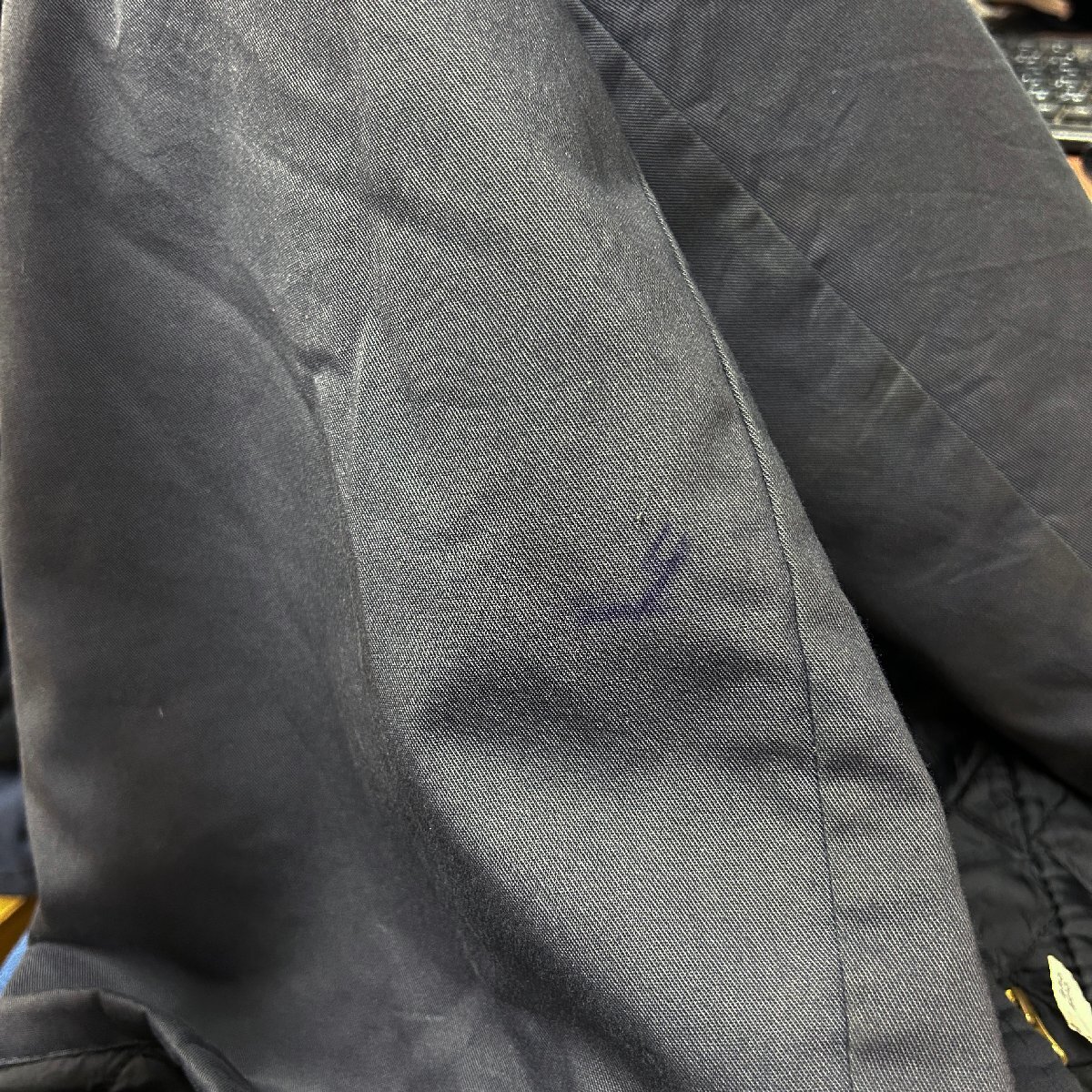 中古品です。使用感があります。袖やボディや襟に汚れ、背中右下付近にペン跡があります。他は特にダメージはありません。