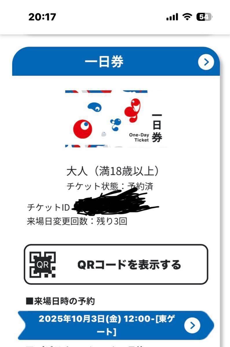 10月3日(金)の12時に東ゲートから入場日時予約済です。行けなくなったため出品いたします。