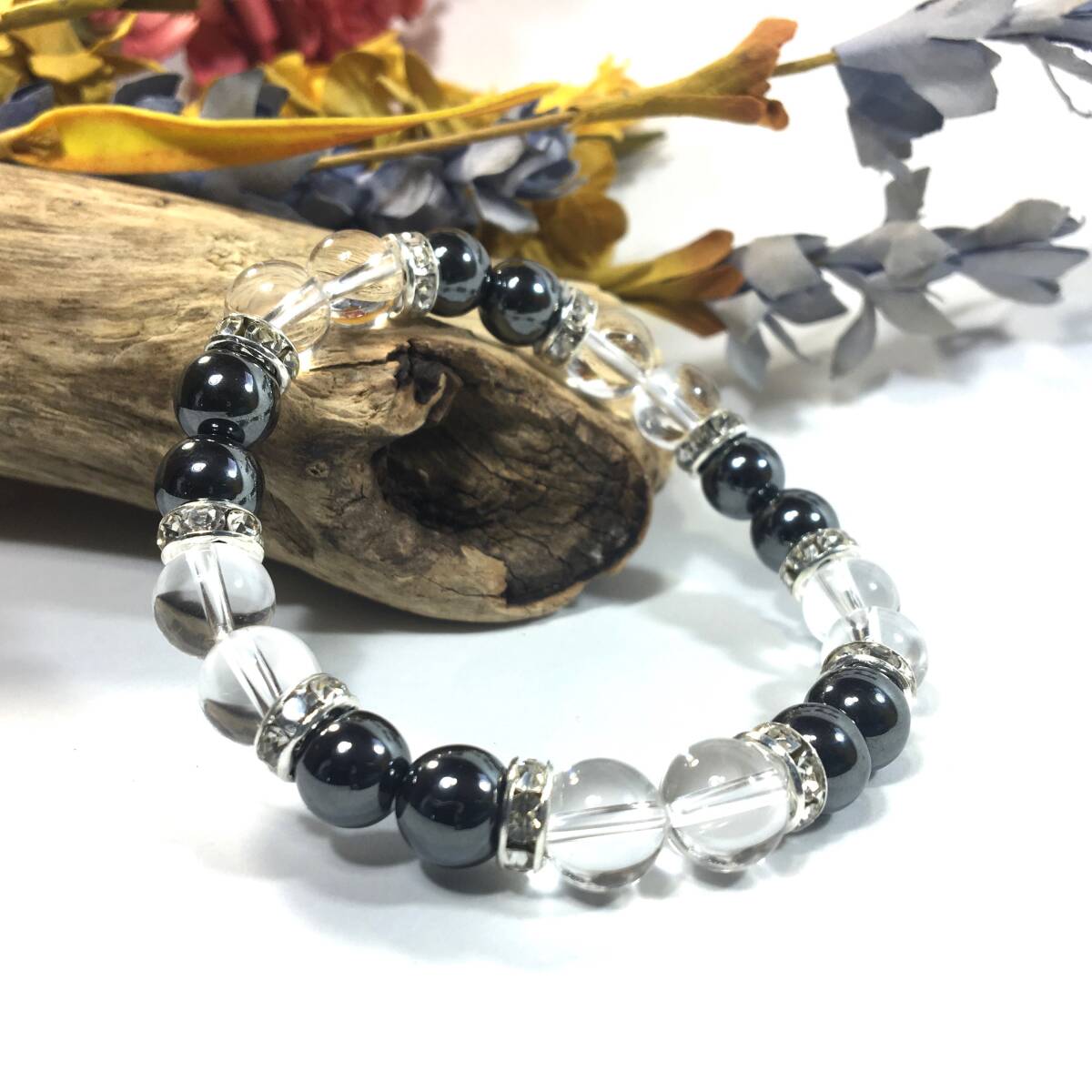 こちらは、8mm玉のヘマタイトと水晶を使ったパワーストーンブレスレットです。シンプルなデザインでどんなコーディネートにも合わせやすいデザインに仕上げています。サイズは内周約15cmです。気になる方は是非この機会にどうぞ。