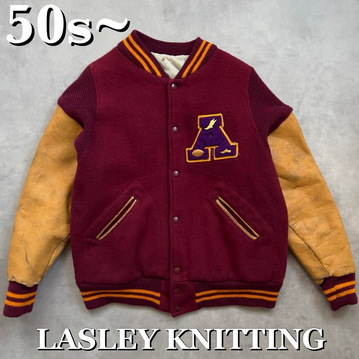 【VINTAGE】50-60s LASLEY KNITTING Wool Leather Stadium Jumper