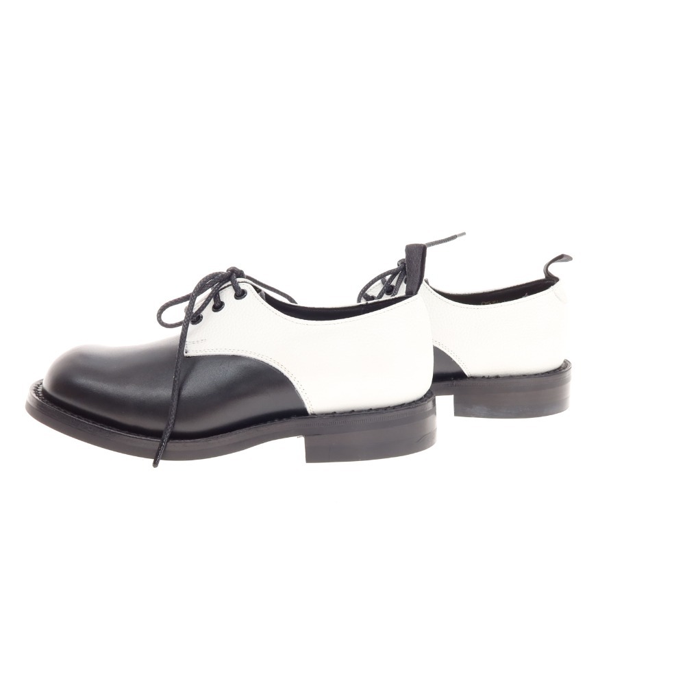 コシのあるカーフ素材とホワイトの型押しレザーを組み合わせたプレーントゥシューズ。ぽてっとしたボリューミーなトゥとパンダカラーのコンビネーションがかわいい一足です。シンプルで高級感がありながら、カジュアルな遊び心も感じさせる一足になっています。