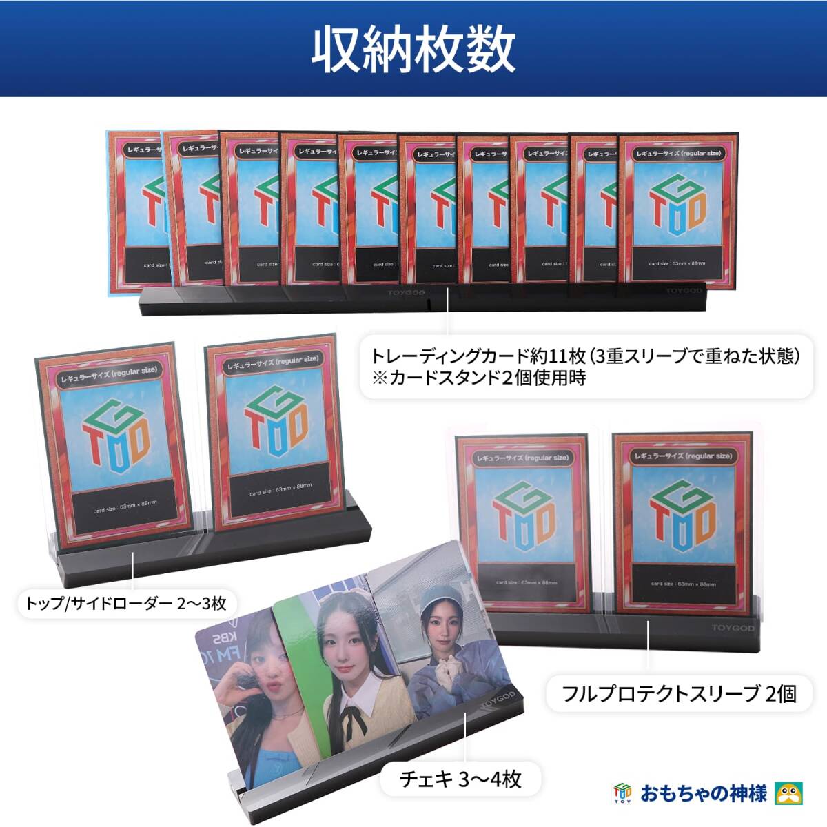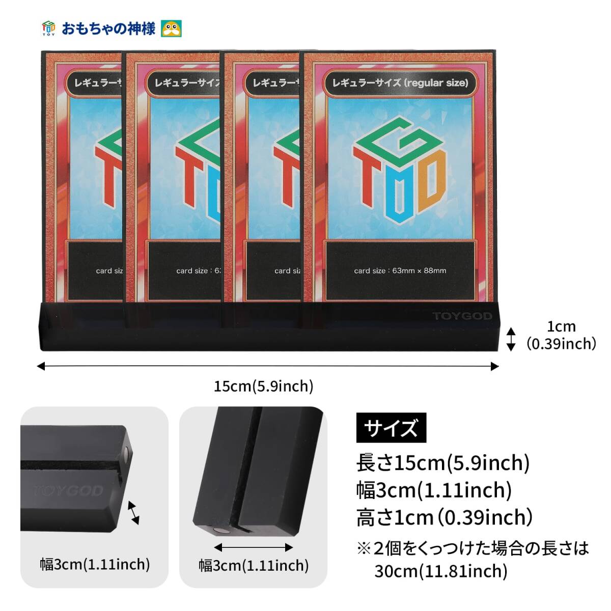 【素材】アクリル 【サイズ】15×3×1cm 【セット数】2個 【置ける枚数】カード 11枚(3重スリーブで重ねた状態)、トップ/再度ローダー 2~3枚、フルプロテクトスリーブ 2個